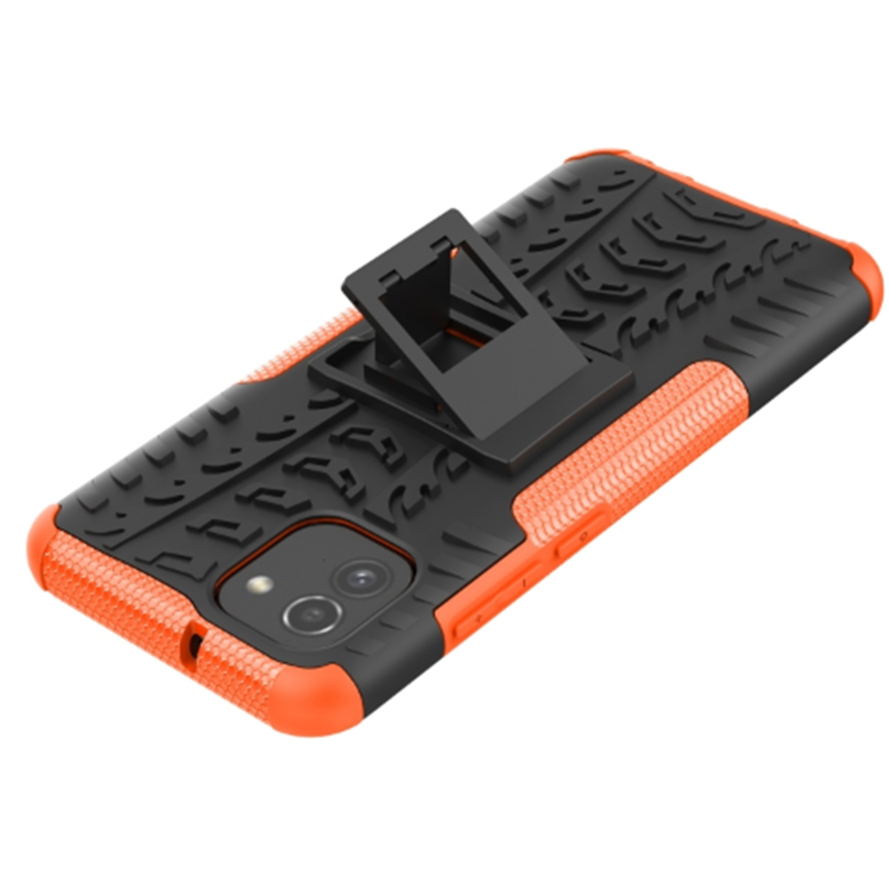 Внутренняя сторона гибкая, плотно прилегает к корпусу Samsung A03 и изготовлена из ТПУ. Нужную жесткость чехлу оказывает внешняя твердая часть. Поверхность противоударной накладки очень приятная на ощупь и делает невозможным выпадение телефона из рук. Также для удобства вмонтирована раскладная ножка, которая быстро трансформируется в подставку.