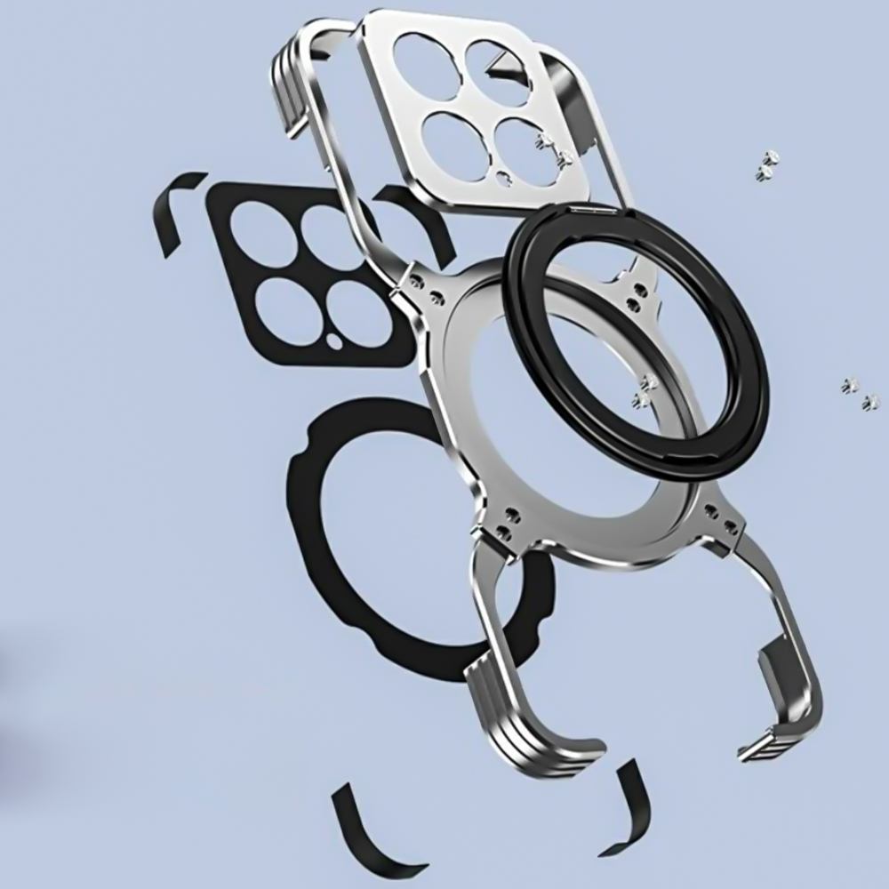 Магнитное кольцо вращается на 360° и может использоваться как подставка или держатель. Отдельный модуль для защиты камеры устанавливается поверх блока объективов, предотвращая появление царапин и попадание пыли.