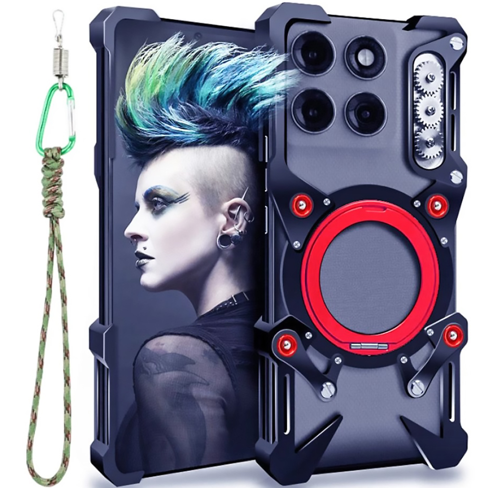 Изготовленный из металла, чехол обеспечивает повышенную прочность и устойчивость к ударам, падениям и царапинам. Его кибер-дизайн с винтовыми элементами и геометрическими линиями придает смартфону уникальный и технологичный вид.