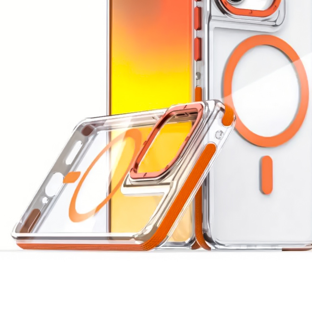 Этот чехол выделяется элегантным дизайном с металлической рамкой для защиты камеры. Материал — термополиуретан, который отличается износостойкостью, гибкостью, устойчивостью к перепадам температур и химическим воздействиям. Встроенное магнитное кольцо MagSafe обеспечивает совместимость с беспроводной зарядкой и аксессуарами. Амортизированные края чехла плотные и при падении обеспечивают высокий уровень защиты от ударов.