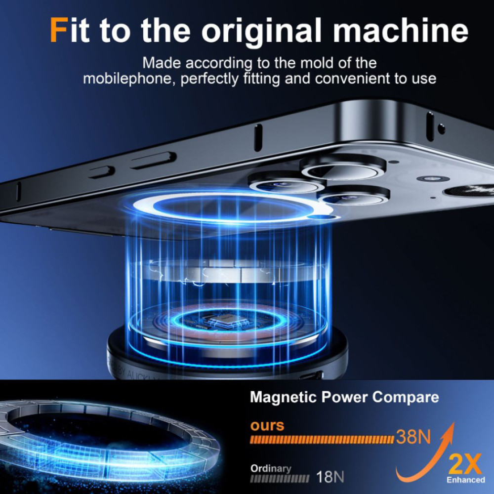 На задней панели есть магнит, позволяющий использовать аксессуары MagSafe, такие как павербанки, зарядные устройства, кошельки и т.д. Чехол поддерживает быструю зарядку, совместимую с беспроводным зарядным устройством Magsafe без снятия чехла.