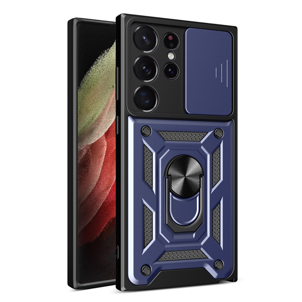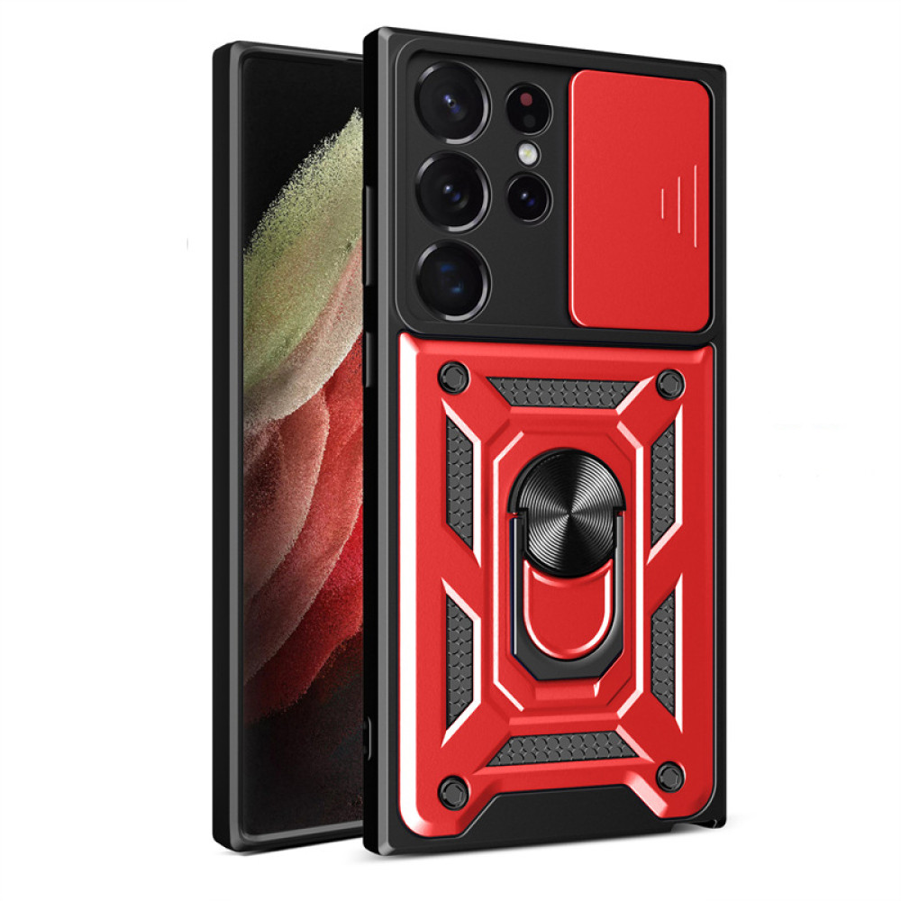 Ricco Camera Sliding - это стильный противоударный чехол с многофункциональным кольцом держателем. Чехол накладка Ricco Camera Sliding - это одна из новых моделей противоударных чехлов, ее выбирают люди, желающие совместить надежную защиту и стиль. Именно бронированный чехол лучше защищает от возможных повреждений, которые могут возникнуть в результате падений и ударов. Основа чехла изготовлена ​​из ТПУ, а задняя крышка из прочного поликарбоната. При необходимости чехол можно разложить на две части, чтобы почистить. Внутренняя часть накладки имеет текстурную поверхность, что обеспечивает хорошее «сцепление» с самым гаджетом, а материал накладки ПК имеет амортизационные свойства. Большим плюсом чехла Ricco Camera Sliding, по сравнению с другими бронированными накладками является то, что он практически не увеличивает объем телефону, соответственно гаджетом все еще можно будет с комфортом пользоваться и носить в кармане. Еще одной из особенностей чехла для Samsung Galaxy S23 Ultra является универсальное металлическое кольцо. Оно находится на внешней части накладки, удобно складывается и может выполнять три функции: подставки, кольца-держателя для комфортного содержания в руке, а также пластины для магнитного автомобильного держателя. Само кольцо может вращаться на все 360 градусов. В Ricco Camera Sliding также предусмотрена дополнительная защита камеры, которая поможет уберечь дорогие мегапиксели от всех возможных внешних и механических повреждений. Все вырезы под камеру, различные разъемы сделано четко под модель Samsung Galaxy S23 Ultra.