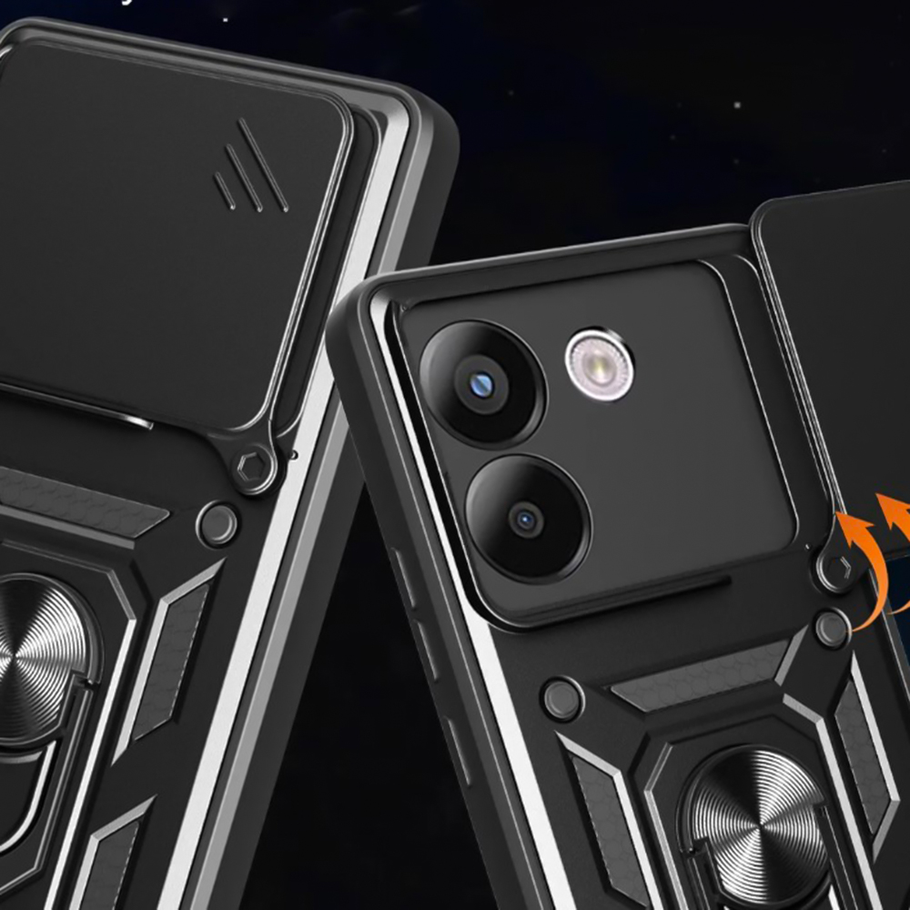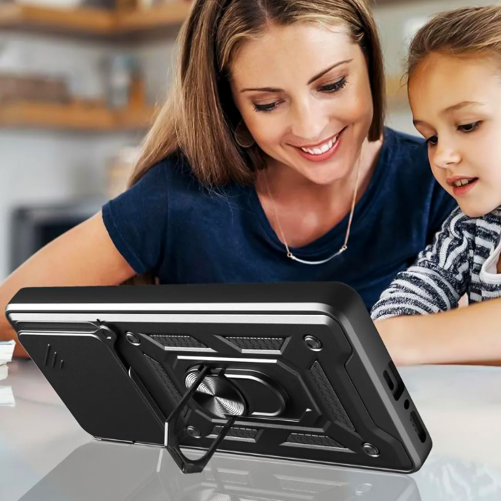 Ricco Camera Sliding - это стильный противоударный чехол с многофункциональным кольцом держателем.  Именно бронированный чехол лучше защищает от возможных повреждений, которые могут возникнуть в результате падений и ударов.