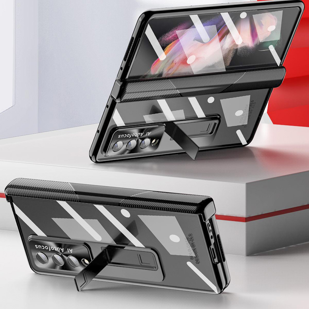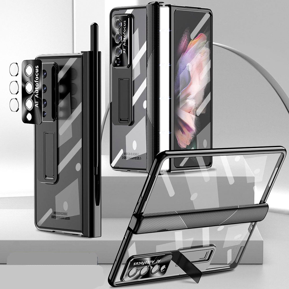 Рамка чехла изготовлена из высококачественного оргстекла и прочного пластика с металлическим напылением, что обеспечит долговечное пользование. Он состоит из двух частей, скрепляемых с помощью бокового фиксатора. Кстати, фиксаторов есть 2 в комплекте. Один со стилусом, а другой более компактный - без него, однако, ребристая поверхность, будет предотвращать скольжение , так что вы сможете выбрать нужный, в соответствии с вашими потребностями. Корпус крепится крепко и не повредится даже при частом вставлении и извлечении. Оргстекло находится внутри обеих частей и покрывает корпус Samsung Galaxy Fold4 сзади и спереди, соответственно экран также. Оно достаточно высоко тонкое, устойчивое к окислению, поэтому не будет желтеть со временем, а также способно выдерживать даже резкие перепады температур и на нем практически не остается следов от пальцев. На задней панели для большего комфорта при использовании смартфона имеется небольшая подставка, которой можно пользоваться как в сложенном виде смартфона, так и в разложенном. Доступ ко всем портам и кнопкам конечно же беспрепятственный.
