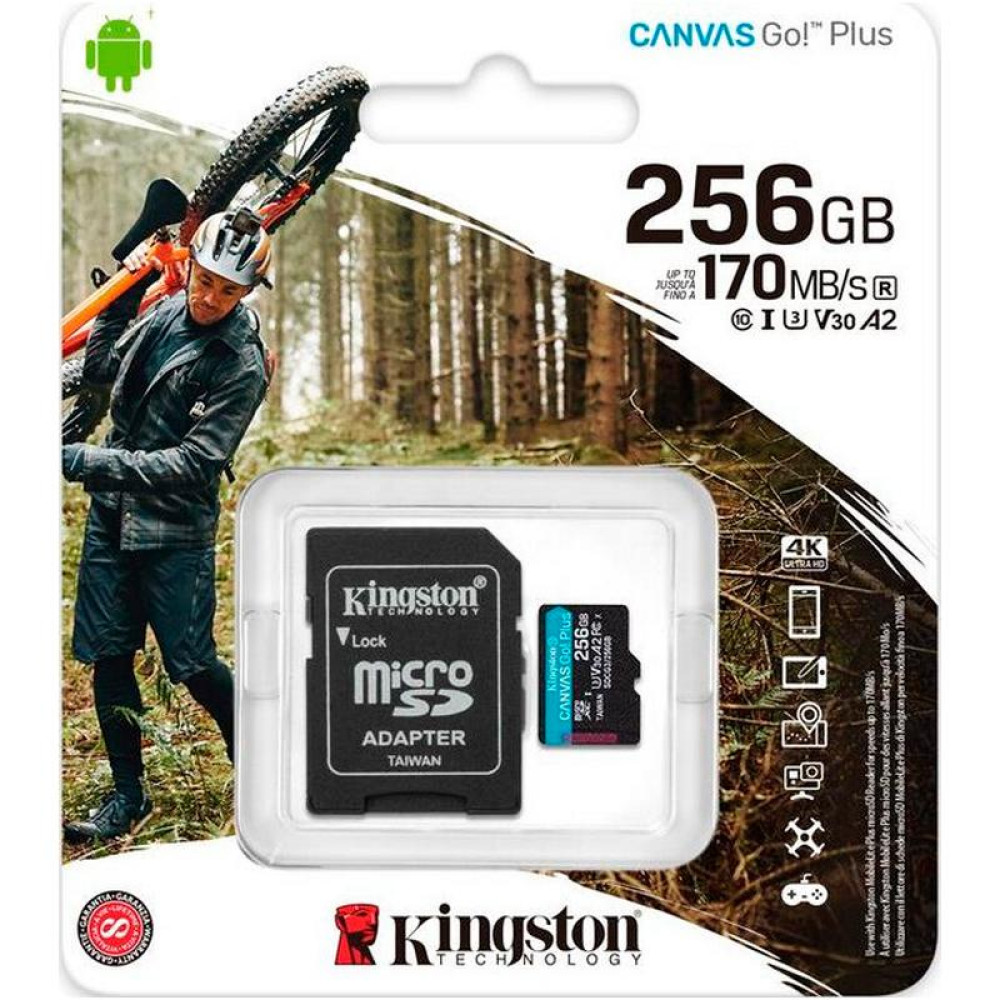 Canvas Go! от Kingston Plus microSD — для искателей приключений, которые всегда в пути, в поисках идеального момента для съемки. С превосходной скоростью передачи до 170МБ/с1, Canvas Go! Карта Plus microSD ускоряет ваш рабочий процесс и повышает эффективность, чтобы в следующем приключении у вас было больше времени на творчество. Скоростные характеристики U3 и V30 позволяют снимать великолепные видео в формате 4K Ultra HD, не беспокоясь о снижении скорости и пропущенных кадрах, или снимать фотографии в режиме серийной съемки, переход между которыми будет плавным и последовательным. Canvas Go!