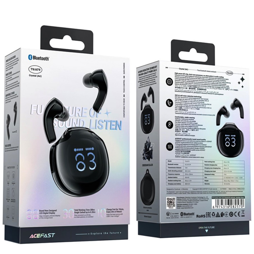 Беспроводные наушники ACEFAST T9 Crystal (Air) поражают своим ярким дизайном. Зарядный кейс сделан в форме стильного футляра без крышки. Наушники фиксируются с обеих сторон с помощью прочного магнита в зоне зарядки, что обеспечивает надежное соединение. При вставке наушников в кейс на светодиодном экране отображается уровень заряда каждого наушника, а также самого кейса.