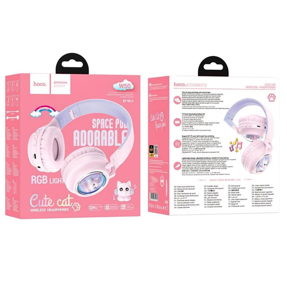 Bluetooth-гарнитура Hoco W50 – это стильные и удобные наушники, которые обеспечивают комфортное использование и высокое качество звука. Дизайн гарнитуры дополнен прозрачными круглыми вставками с обеих сторон наушников, внутри которых элегантно расположены фигурки милого котика, создавая весёлую атмосферу. Также RGB подсветка привлекает внимание и подчеркивает современный стиль. Корпус выполнен из прочного ABS-пластика, а мягкие амбушюры обшиты износостойким кожзамом, что гарантирует долговечность и комфорт даже при длительном использовании.