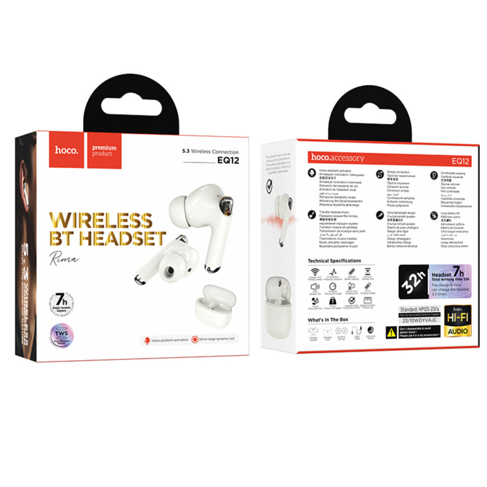 Наушники HOCO EQ12 Rima true wireless BT headset Milky White ─ это высокотехнологичные вакуумные наушники, отличающиеся функциональностью, небольшим весом и способностью передавать детализированный звук в Hi-Fi качестве, сохраняя оригинальное звучание музыкальных композиций.