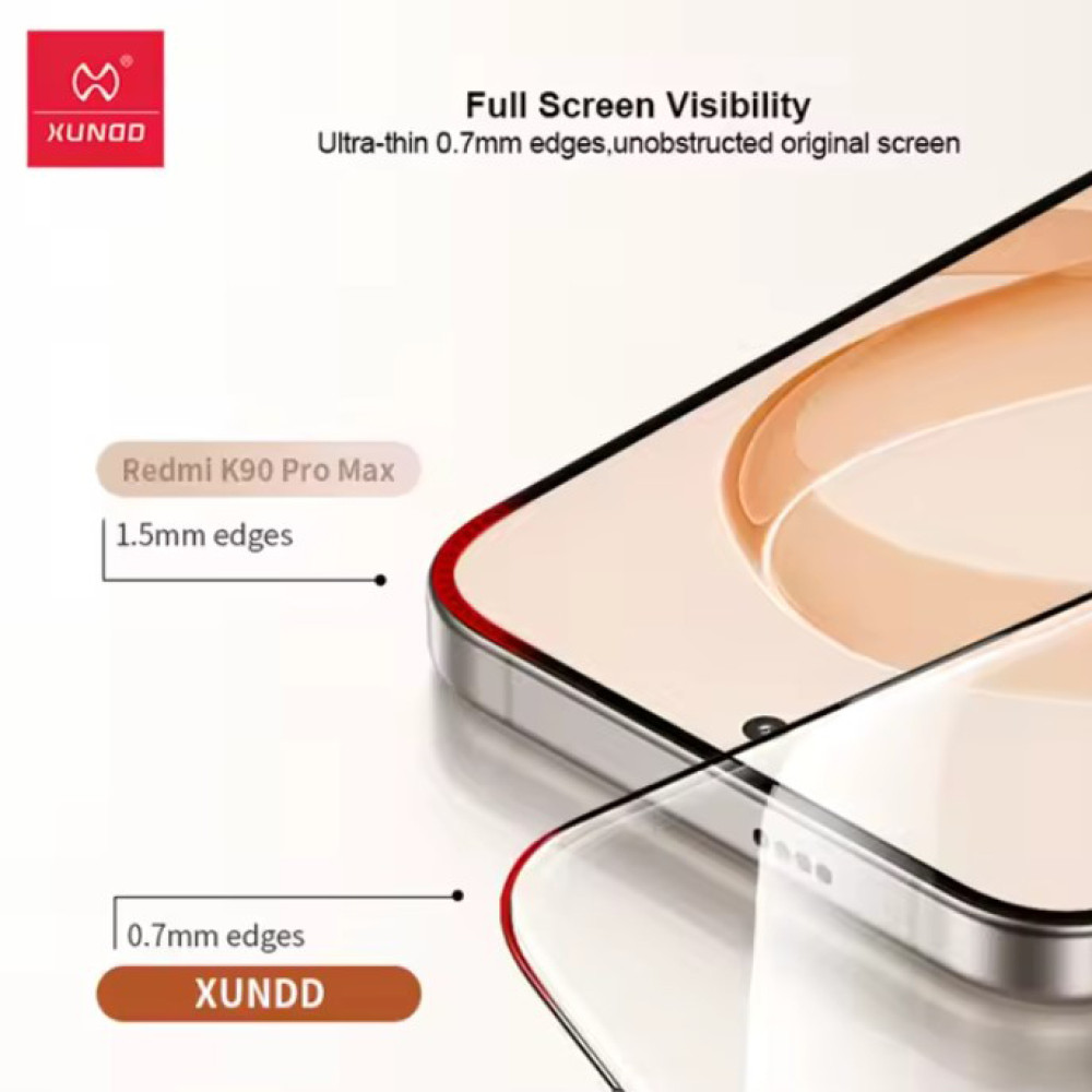 Закалённое защитное стекло XUNDD Full Screen дляPoco F8 Ultra / Redmi K90 Pro Maxобеспечивает надежную защиту вашего экрана от царапин, ударов и повреждений. Это стекло полностью покрывает экран вашего смартфона, при этом сохраняя четкость изображения и чувствительность сенсора.