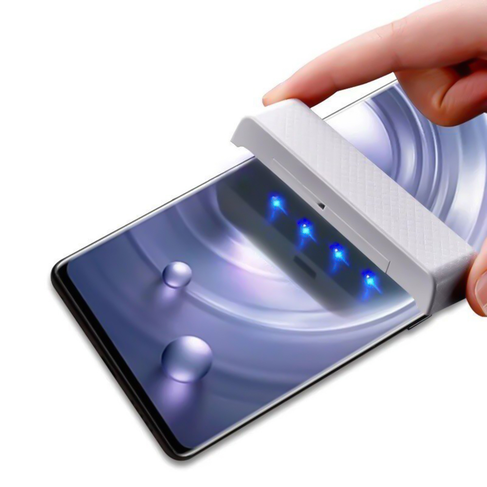 Процесс застывания клея происходит под действием ультрафиолета, излучаемого лампой. Необходимо нанести 3-4 капли клея на экран гаджета, снять защитную пленку со стекла и поставить его (стекло) на экран. После того, как клей вытеснит из-под стекла воздух при необходимости можно выровнять стекло относительно изогнутых краев экрана Realme 12 Pro / 12 Pro Plus. Финальный этап – это установка телефона под лампу на 120 секунд, лампа подключается к питанию через порт Type-C / Micro-USB.