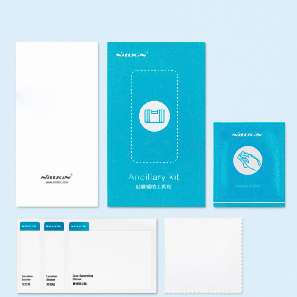 В комплект входит всё необходимое для самостоятельной и точной установки: очищающие салфетки, стикеры и инструкция от Nillkin.