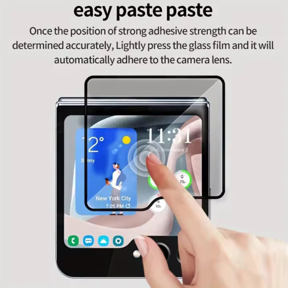 Стекло формата Full Screen полностью закрывает фронтальную панель Samsung Galaxy Flip6 или Flip7 FE. Черная рамка по периметру точно совпадает с дизайном смартфона, поэтому после установки защитный слой остается почти незаметным. Высокий уровень твердости материала обеспечивает надежный барьер против царапин, потертостей от ключей и других механических повреждений, которые часто возникают во время ежедневного использования.