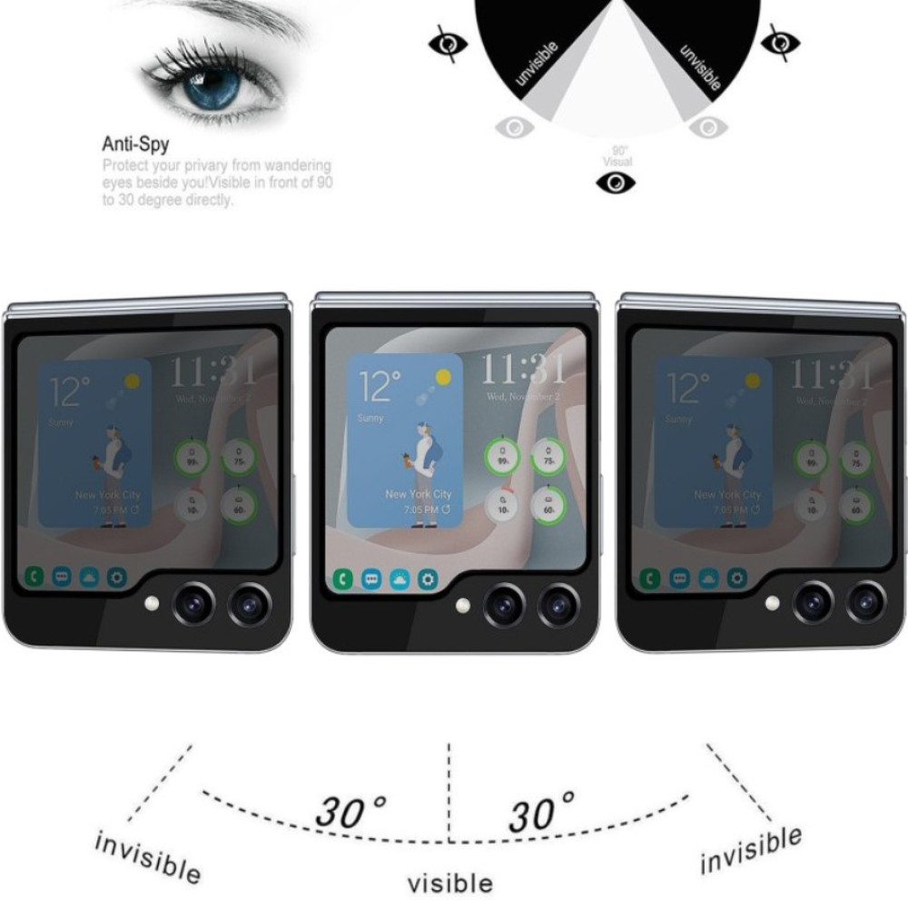 Защитное стекло Privacy Full Screen для Samsung Galaxy Flip6 / Flip7 FE — это защитное стекло, разработанное для тех, кто ценит приватность и стремится сохранить внешний вид своего устройства в идеальном состоянии. Главной особенностью аксессуара является технология Privacy, которая ограничивает углы обзора дисплея. Благодаря этому информация на экране остается видимой только для владельца, в то время как для людей рядом дисплей будет выглядеть затемненным.