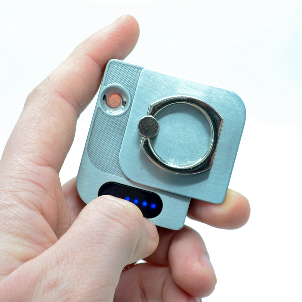 Держатель кольцо для телефона с зажигалкой ZK805 - это удобный и стильный аксессуар для курящих людей. У курящих людей всегда есть проблема в поиске зажигалки в кармане, сумке или в салоне автомобиля, данный товар предназначен для решения этой проблемы, ведь благодаря клейкой основе, вы сможете прочно закрепить прикуриватель к вашему смартфону. преимуществом данной модели является то, что она также используется как держатель кольца для телефона.Чтобы активировать прикуриватель, достаточно всего подвинуть верхнюю панель вправо и нажать  на специальную кнопку. Заряжается данная модель через Micro USB порт, кабель Micro USB входит в комплект.