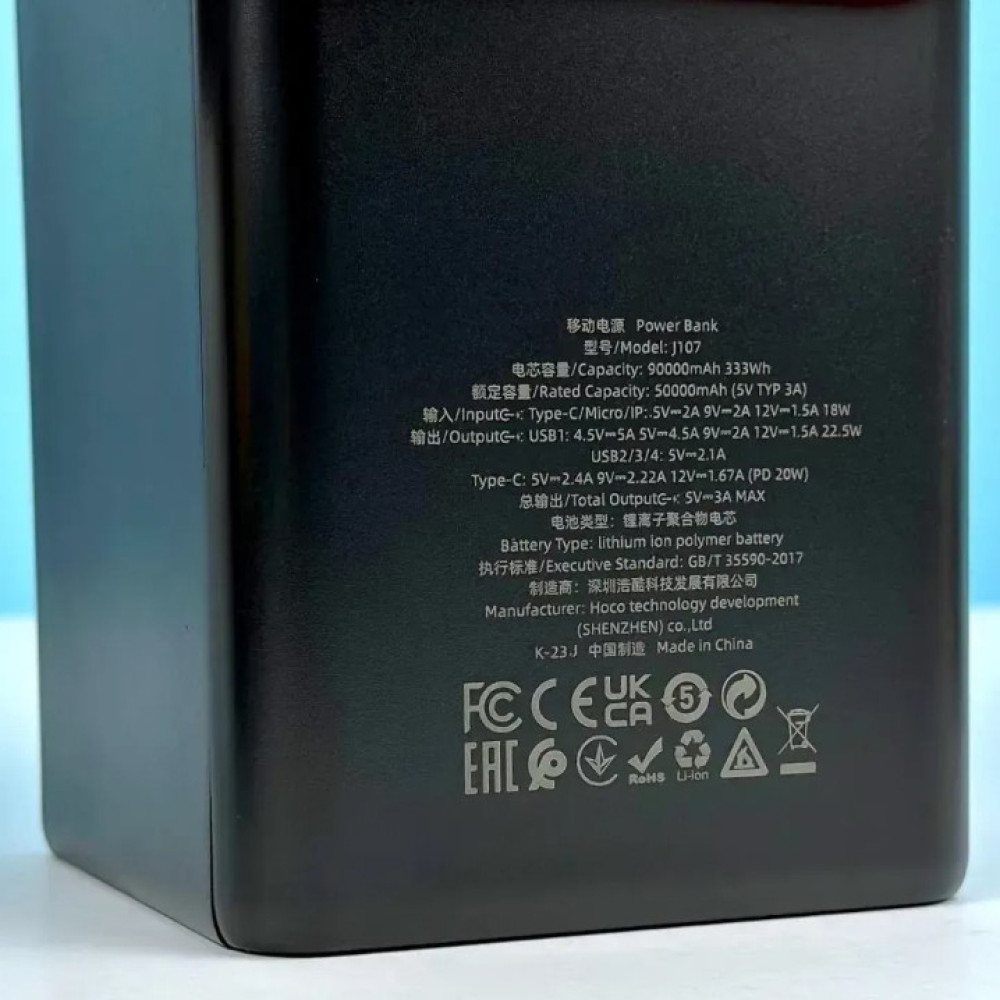 Hoco J107 поддерживает ускоренное пополнение энергии через входы MicroUSB (18W), Type-C (18W) и Lightning (10W). Для зарядки внешних устройств предусмотрены четыре USB-порта мощностью 22.5W и Type-C на 20W. Одновременно можно подключить до пяти гаджетов.