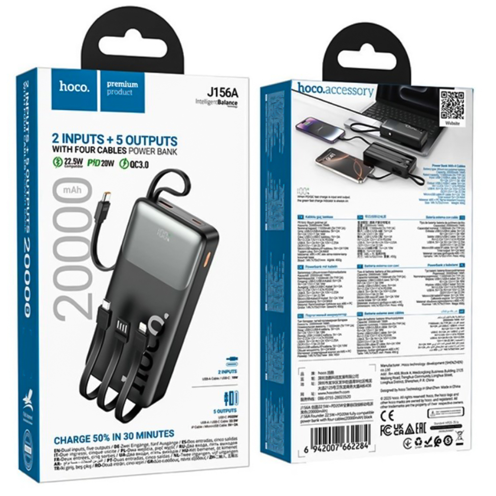 Модель поддерживает быструю зарядку мощностью до 22.5W с технологиями PD и QC 3.0, что позволяет сократить время пополнения заряда совместимых устройств. Особенностью HOCO J156A являются встроенные кабели, устраняющие необходимость носить с собой дополнительные провода и обеспечивающие максимальное удобство в ежедневном использовании.