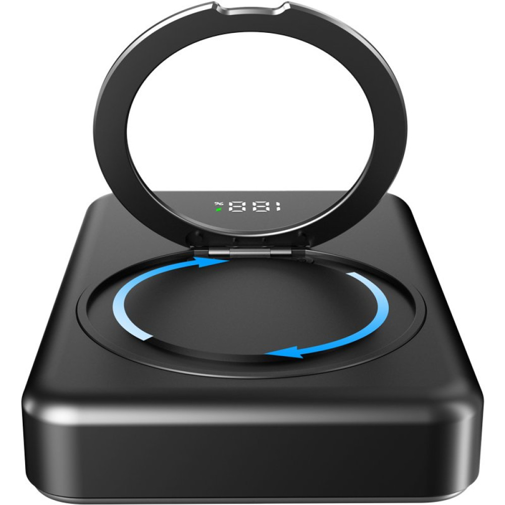 Особым преимуществом является встроенная подставка-кольцо, вращающаяся на 360°, благодаря которой смартфон можно зафиксировать в вертикальном или горизонтальном положении. Это удобно для просмотра видео, видеозвонков или стримов, ведь телефон остается заряженным и одновременно работает в комфортном режиме. Повербанк оснащён литий-полимерным аккумулятором ёмкостью 10 000 мАч, а цифровой LED-индикатор отображает уровень заряда в процентах, позволяя всегда контролировать запас энергии.