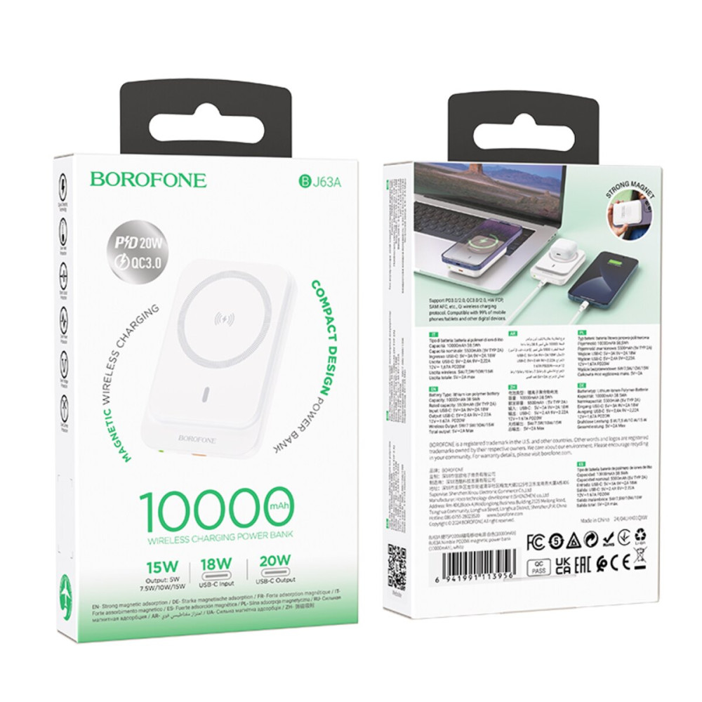 Внешний аккумулятор BOROFONE BJ63A Nimble с беспроводной зарядкой обеспечит бесперебойную работу ваших устройств, где бы вы ни находились. Корпус из ABS-пластика и поликарбоната не только придает стильный внешний вид, но и обладает огнестойкими свойствами, что делает его надежным и безопасным в использовании. Специальный LED-индикатор позволяет отслеживать уровень заряда, а компактные размеры делают этот портативный аккумулятор отличным решением для повседневного использования дома, на работе или во время командировок и путешествий. Емкость 10 000 mAh обеспечивает многократную зарядку ваших устройств без необходимости частой подзарядки самого аккумулятора. Устройство оснащено комбинированным портом USB Type-C мощностью 18 W (вход) и 20 W (выход) с поддержкой протоколов быстрой зарядки PD/QC/FCP/AFC. Беспроводная зарядка мощностью 5 W, 7,5 W, 10 W и 15 W (MagSafe 7,5 W) для смартфонов, смарт-часов и беспроводных наушников. Аккумулятор BOROFONE BJ63A Nimble станет незаменимым помощником для всех, кто ценит надежность и удобство в повседневной жизни.
