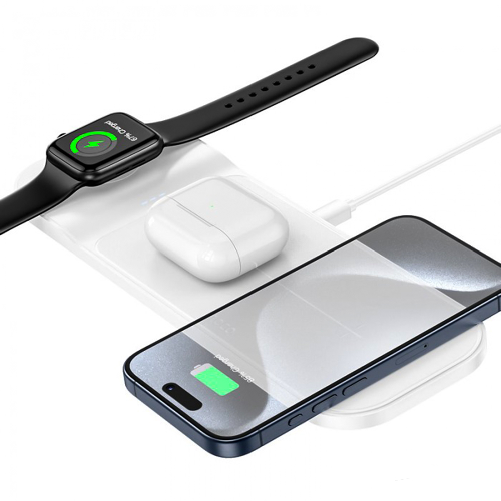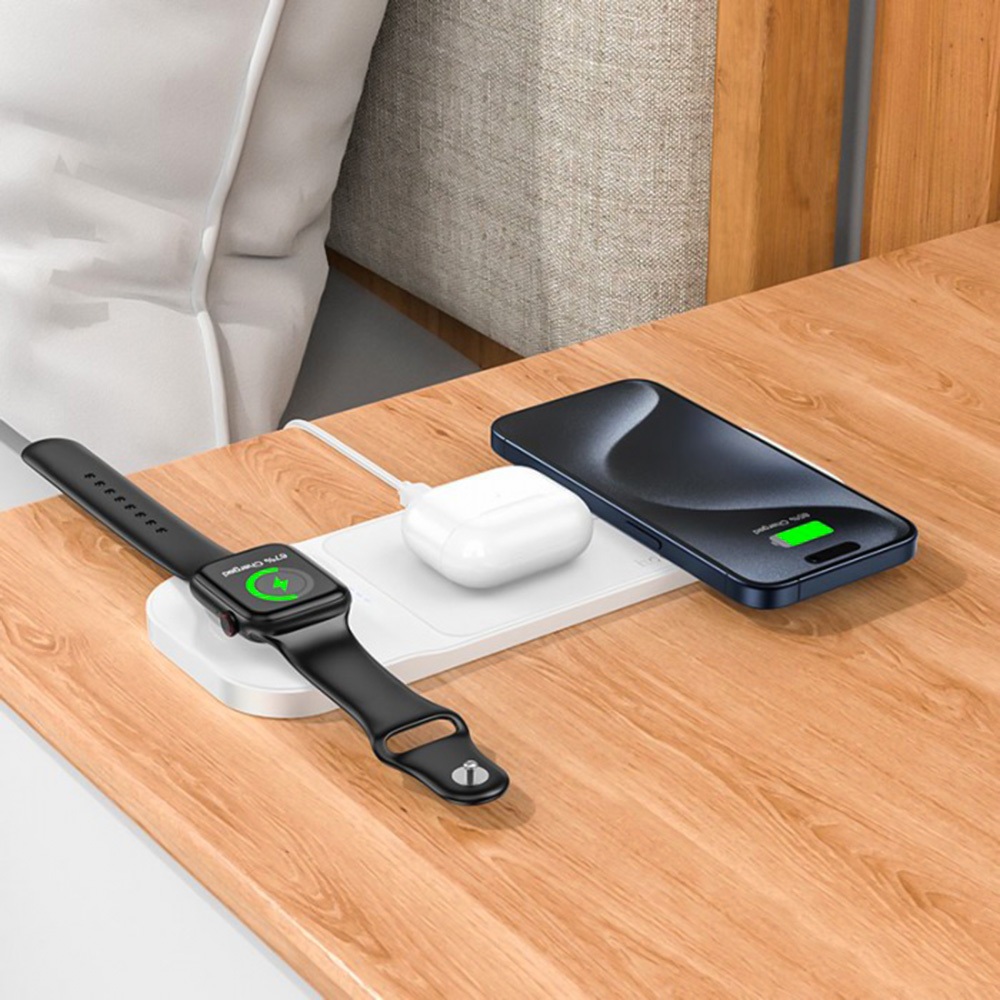Hoco CQ5 – универсальная док-станция, которая позволяет заряжать одновременно смартфон, TWS-наушники и смарт-часы, упрощая управление устройствами и сокращая необходимость в проводах.