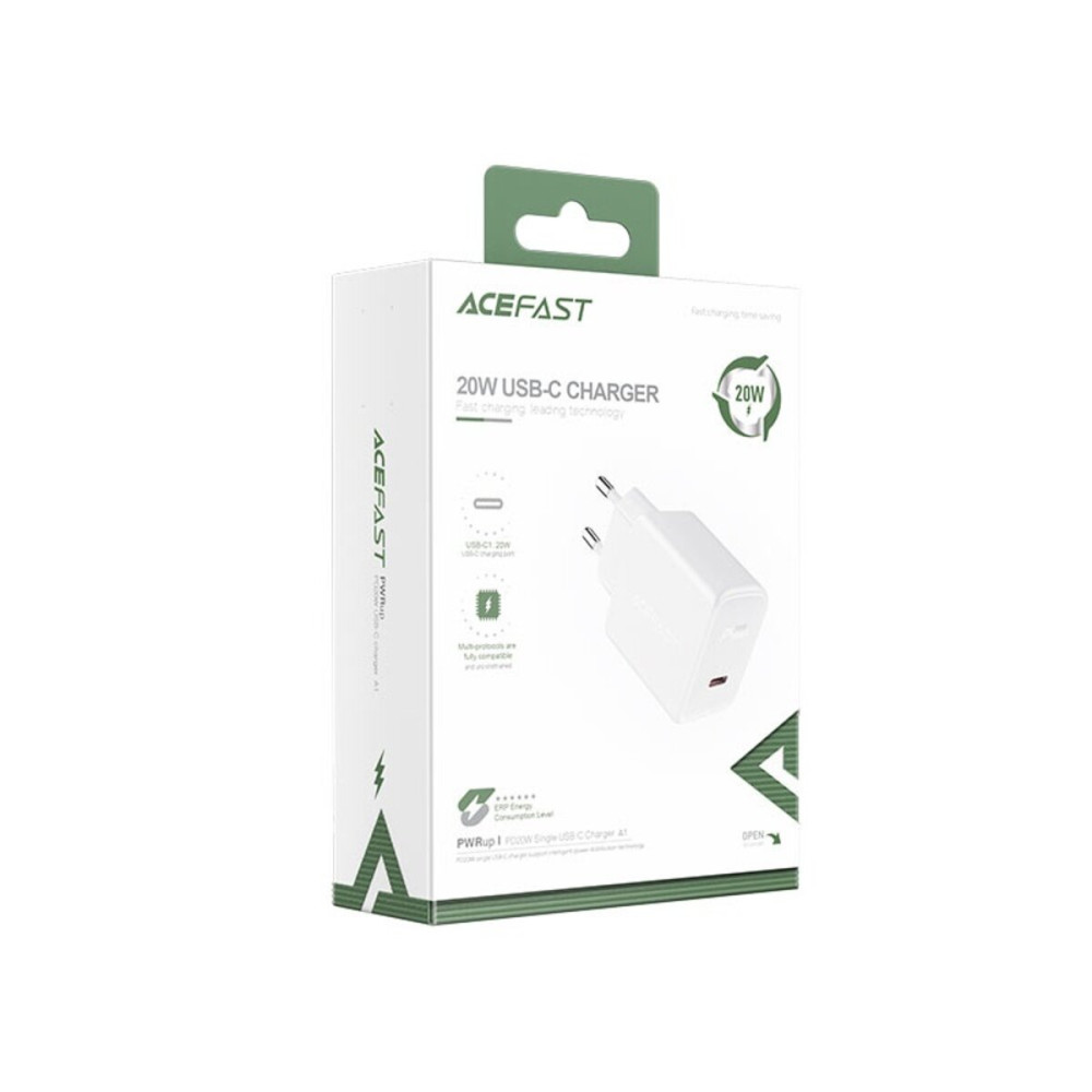 Сетевое зарядное устройство ACEFAST A1 — компактный и надёжный адаптер с поддержкой быстрой зарядки и мощностью 20 Вт, совместимый с большинством смартфонов и планшетов.