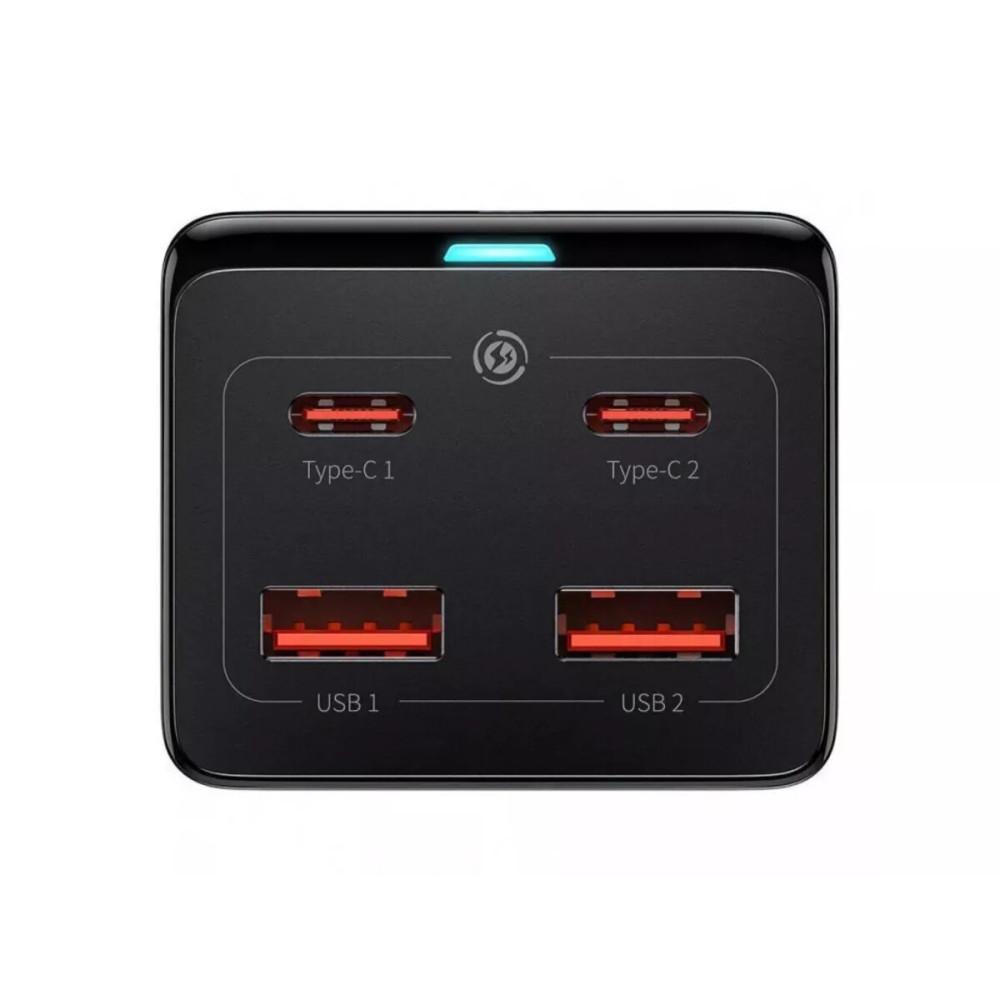 Зарядное устройство оснащено четырьмя USB-портами – двумя USB-C и двумя USB-A, а также розеткой переменного тока 230 В. Это позволяет одновременно заряжать до четырех устройств и подключать дополнительное оборудование, например монитор, принтер или компьютер.