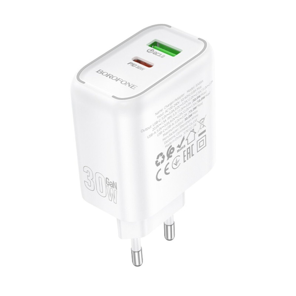 Сетевое зарядное устройство BOROFONE BA89A Destello PD30W+QC3.0 Charger (EU) White — это универсальное и мощное зарядное устройство с двумя портами: USB Type-C и USB-A. Оно поддерживает технологии быстрой зарядки Power Delivery (PD) мощностью до 30 Вт и Quick Charge 3.0 (QC3.0), что позволяет быстро и безопасно заряжать различные гаджеты.