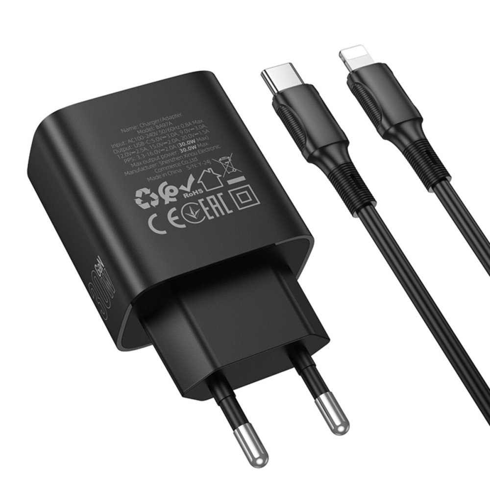 Сетевое зарядное устройство BOROFONE BA97A Ilustre Single-Port PD30W Charger with Digital Display Set (C to iP) (EU) Black — это компактное и мощное устройство для быстрой и безопасной зарядки современных гаджетов. Оно оснащено одним USB Type-C портом и поставляется в комплекте с кабелем Type-C to Lightning, что делает его идеальным выбором для владельцев устройств Apple. Встроенный цифровой дисплей позволяет в реальном времени отслеживать мощность зарядки, повышая удобство использования.