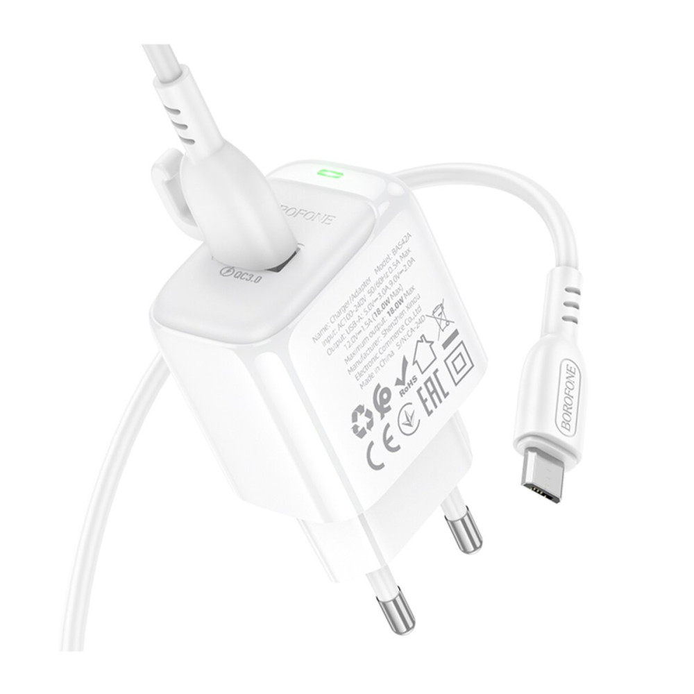 Сетевое зарядное устройство BOROFONE BAS42A Potential оснащено портом USB-A для эффективной зарядки ваших девайсов. Он совместим со многими современными устройствами: повербанками, смартфонами, планшетами, наушниками, акустическими системами разных производителей. Максимальная выходная мощность адаптера составляет 18 Вт. Имеется поддержка протоколов быстрой зарядки QC3.0, FCP, AFC. Корпус изготовлен из качественного ABS-пластика. Компактный размер (74,5×41×29 мм) гарантирует, что зарядное устройство будет вашим надежным спутником в любом путешествии, обеспечивая быструю и эффективную зарядку ваших любимых гаджетов, где бы вы ни находились. Высококачественные материалы и производственные стандарты обеспечивают долговечность и надежность зарядного устройства. В комплекте с зарядным устройством поставляется высококачественный и надежный кабель USB-A to micro-USB длиной 1 м, чтобы вы могли сразу приступить к зарядке ваших устройств.