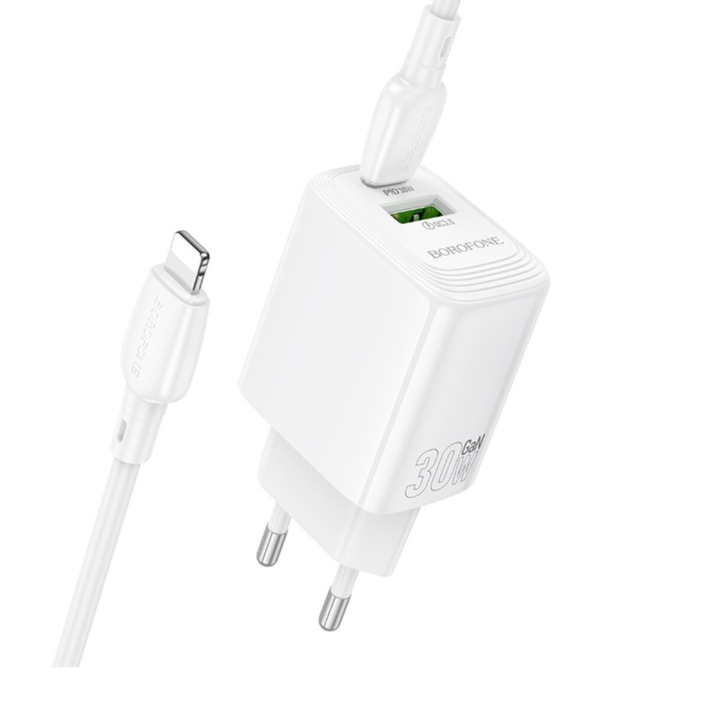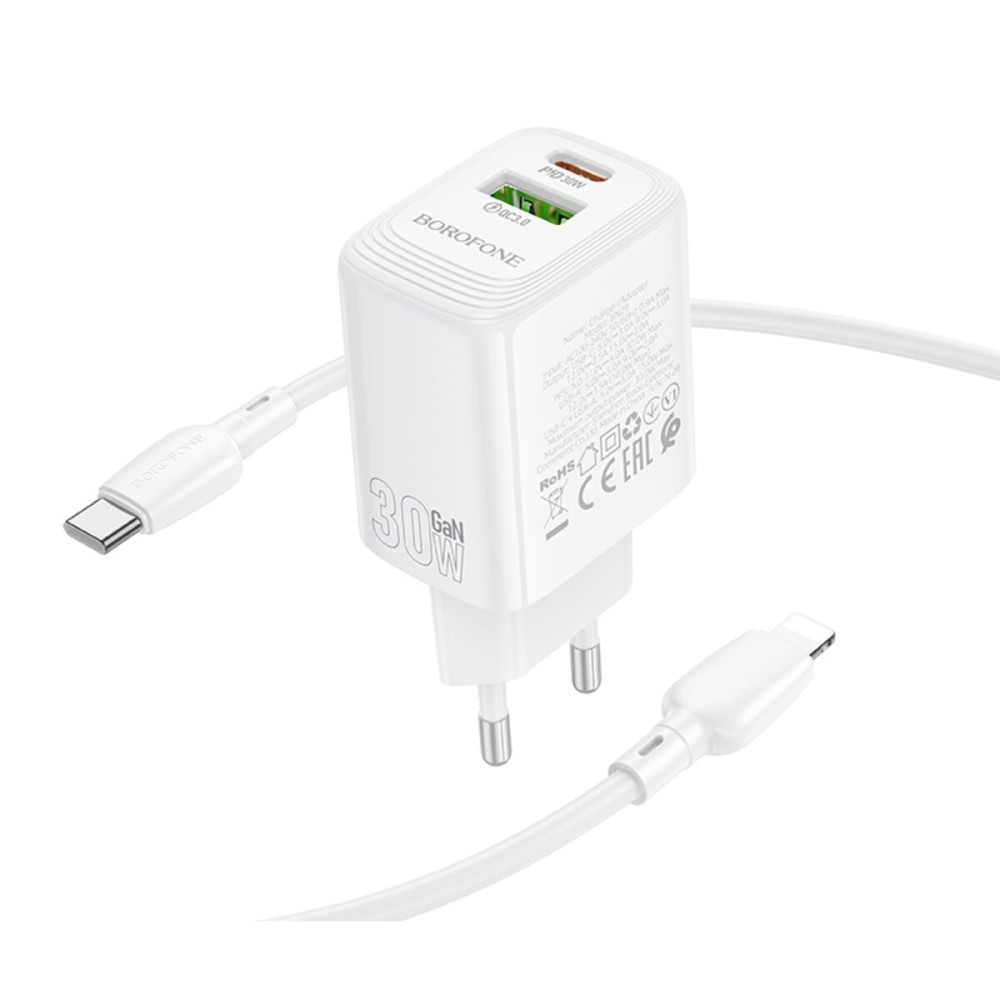 Сетевое зарядное устройство BOROFONE BN29 Fuente PD30W+QC3.0 charger set (C to iP) (EU) White — это компактное и мощное зарядное устройство, обеспечивающее быструю и стабильную зарядку смартфонов, планшетов и других гаджетов. Благодаря поддержке современных технологий быстрой зарядки PD 30W и QC 3.0, устройство гарантирует эффективную подзарядку в минимально короткие сроки.