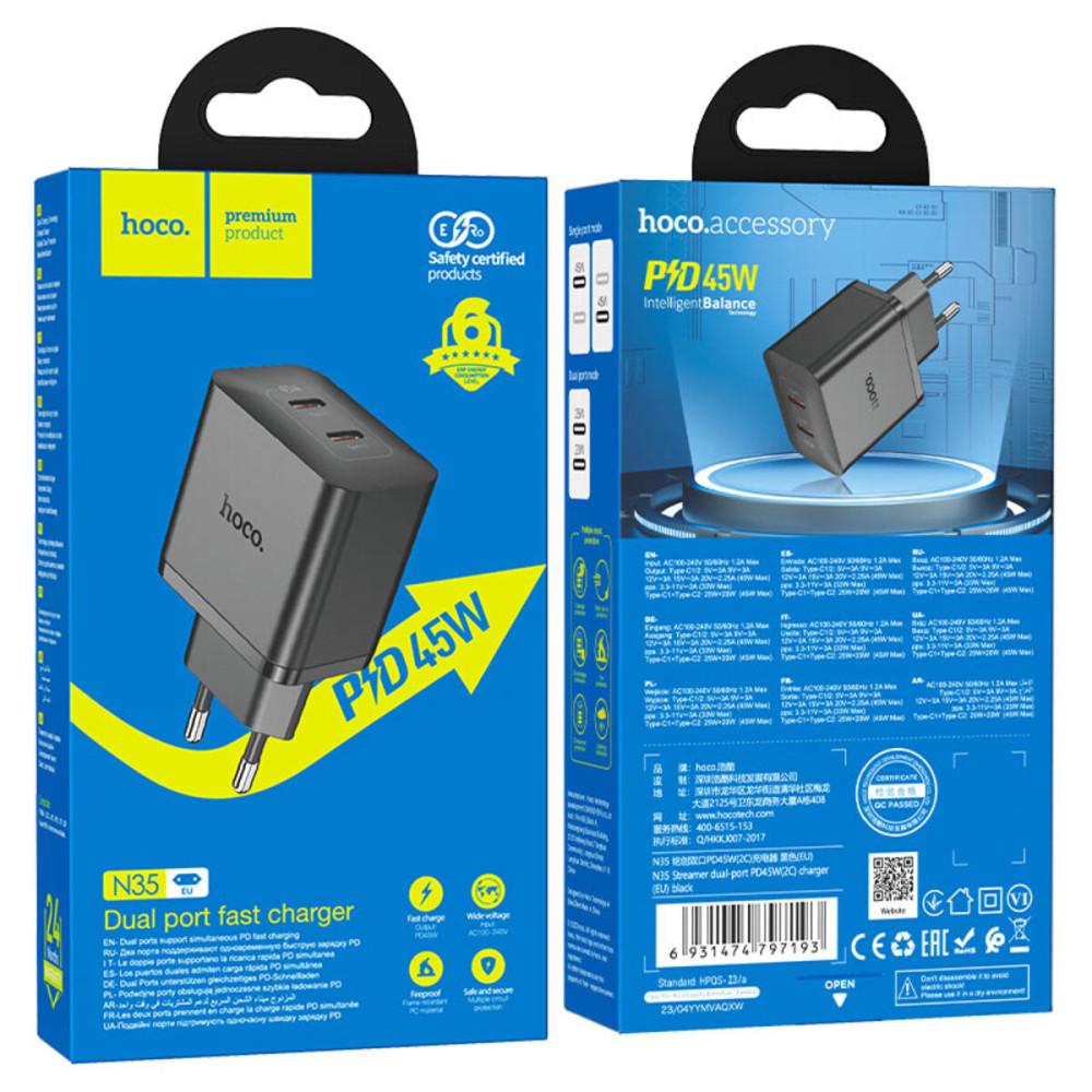 Сетевое зарядное устройство HOCO N35 Streamer имеет два порта Type-C для эффективной зарядки ваших девайсов. Оно совместимо со многими современными устройствами: пауэрбанками, смартфонами, планшетами, акустическими системами различных производителей.