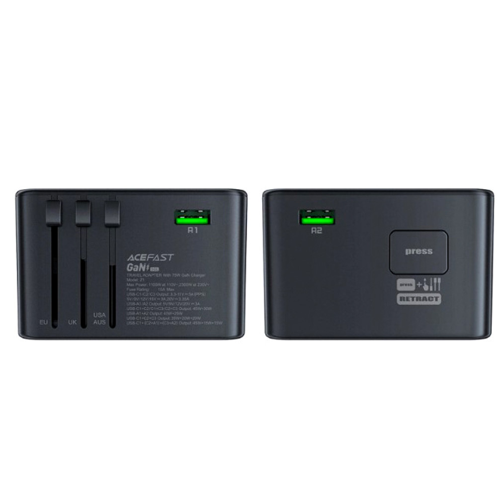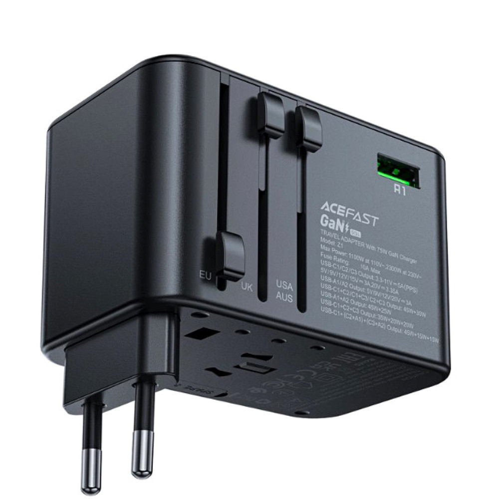 Acefast Z1 - это зарядное устройство и адаптер для путешествий с технологией GaN, которое обеспечивает быструю и эффективную зарядку до 75 Вт по стандарту Power Delivery. Он имеет 3 порта USB-C и 2 порта USB-A.