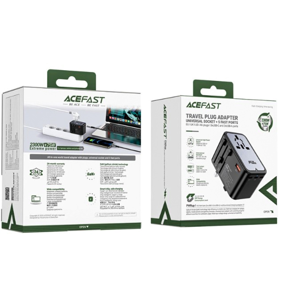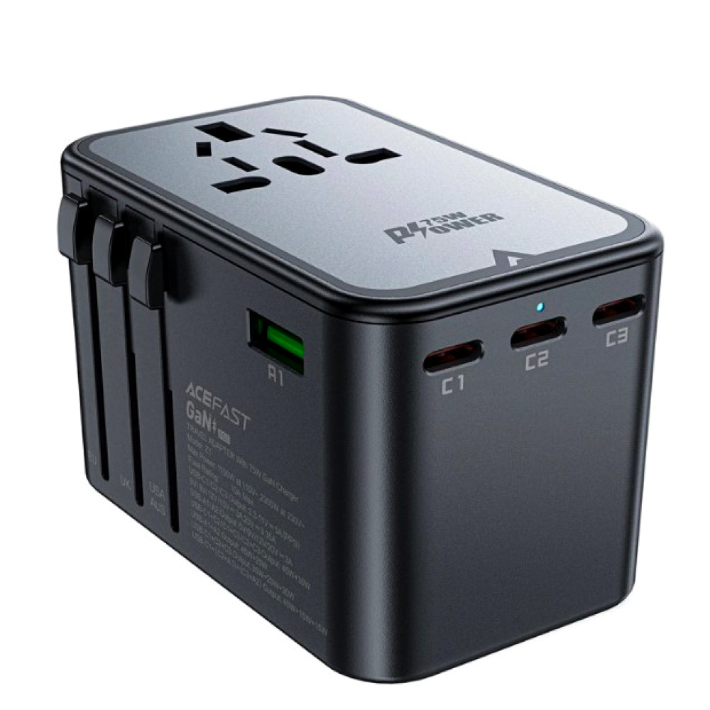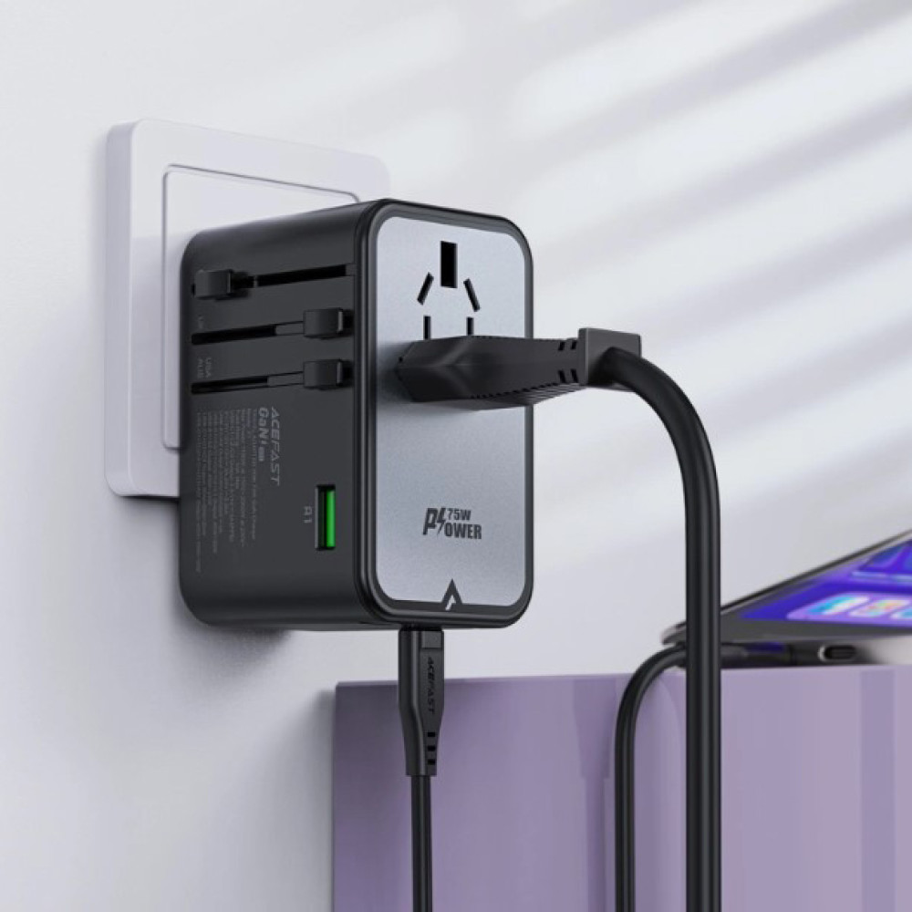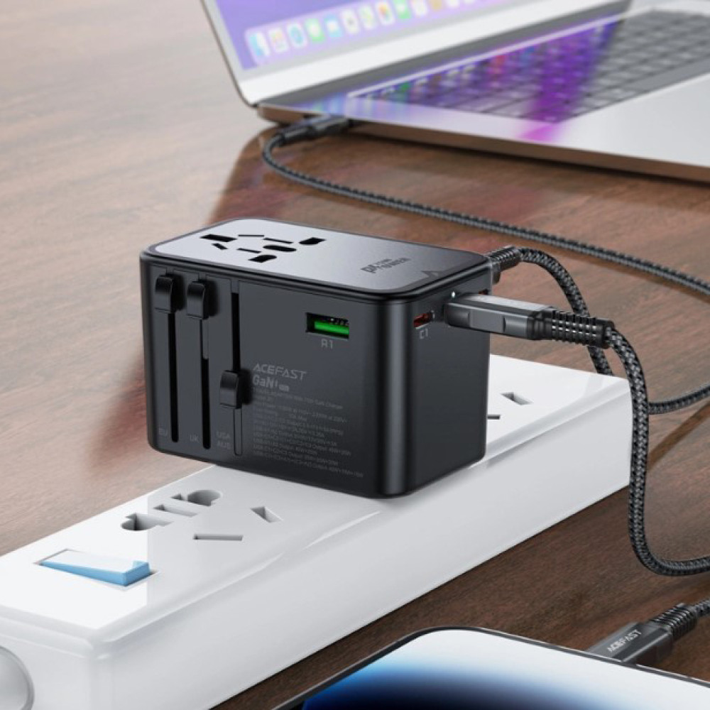 Acefast Z1 – это универсальное решение для зарядки ваших устройств во время путешествий за границу. Данный адаптер сочетает в себе передовую технологию, универсальность и высокие стандарты безопасности. Благодаря использованию технологии галлия азота (GaN), он стал меньше, эффективнее и работает при более низкой температуре, чем традиционные зарядные устройства.
