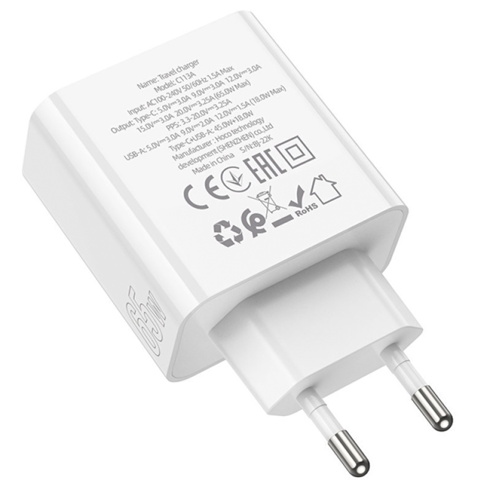 Максимальная мощность на выходе разъема Type-С может достигать 65Вт (5V/3A, 9V/3A, 12V/3A, 15V/3A, 20V/3.25A), на выходе USB - 18Вт (5V/3A, 9V/2A, 12V/1.5A). Модель также поддерживает технологии BC1.2, DASH, VOOC, Super VOOC и некоторые другие. Во время одновременной зарядки двух гаджетов максимальная мощность на выходе разъема Type-C будет ограничена 45Вт.