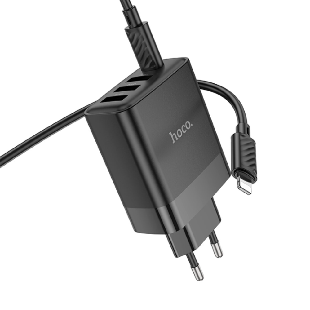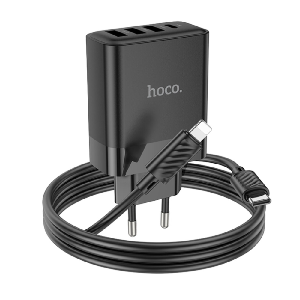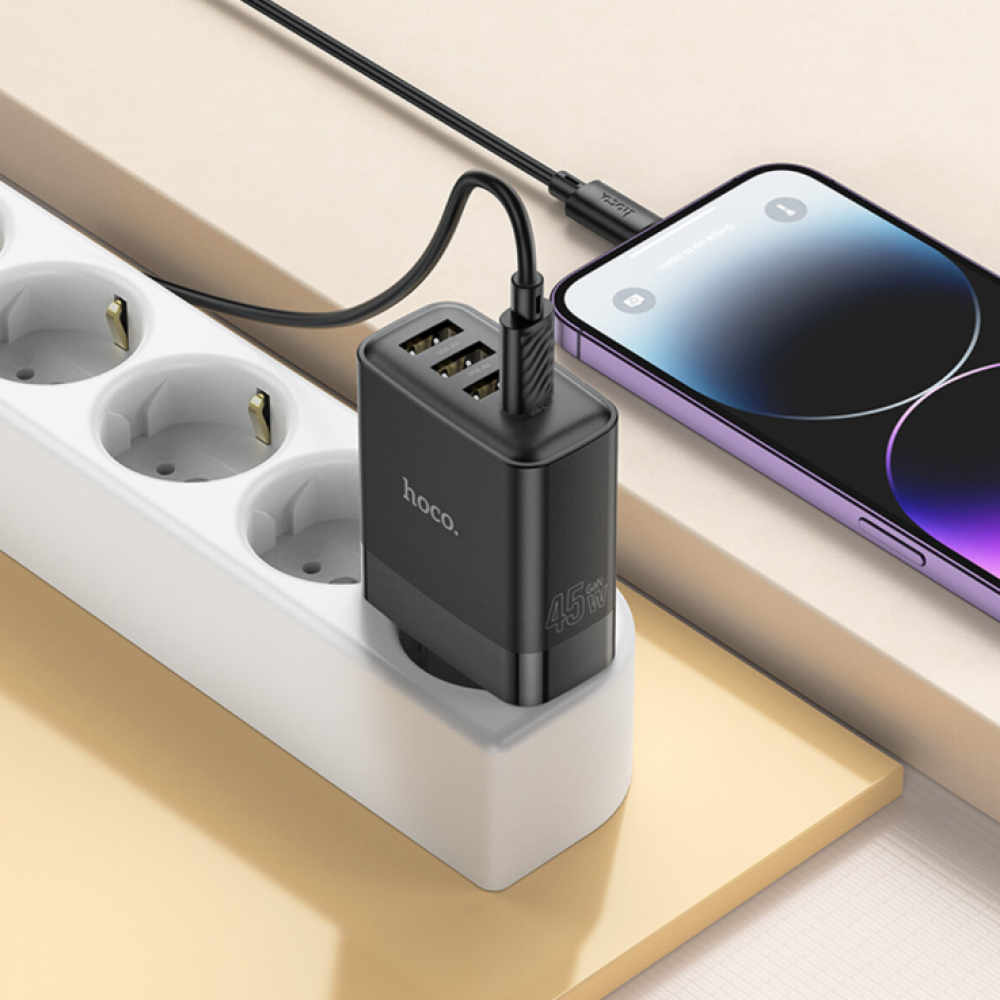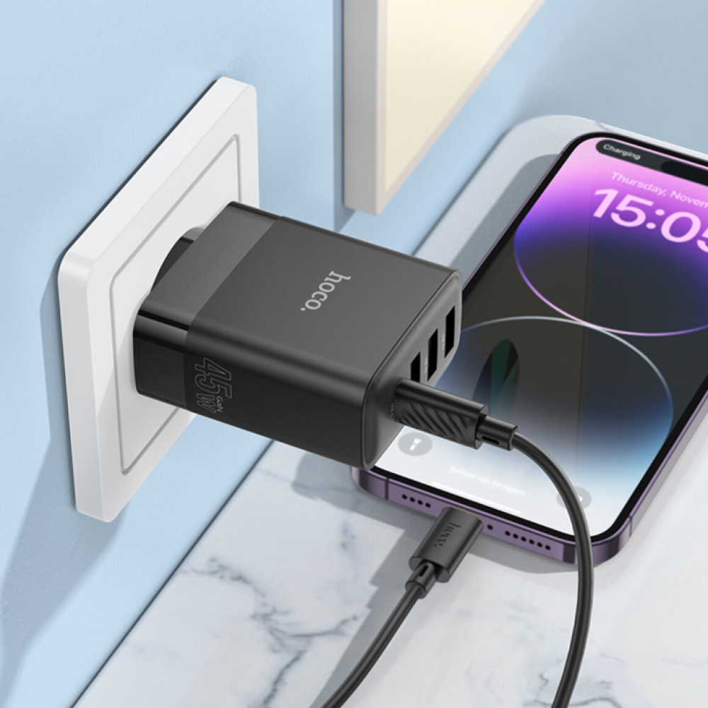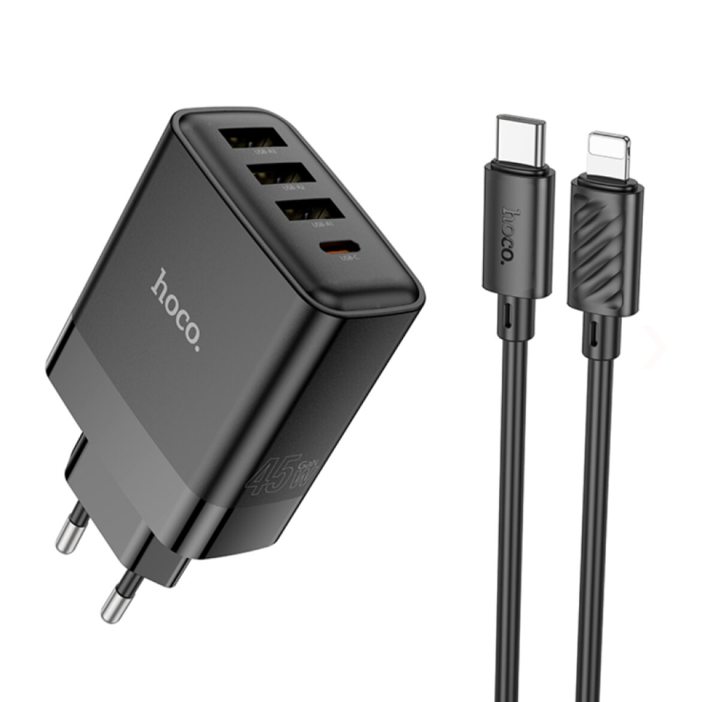 Hoco C127A – надежный сетевой адаптер, обеспечивающий быструю зарядку до 4 устройств одновременно. Благодаря высококачественным компонентам и поддержке технологий быстрой зарядки QC и PD он обеспечивает безопасную и эффективную зарядку с максимальной мощностью 45W. Встроенный умный чип распределяет поток тока, а монолитная конструкция обеспечивает стабильную работу без перегрева и перепадов напряжения. В комплекте есть кабель Type-C - Lightning! 4 порта: Type-C, 3 – USB-A.