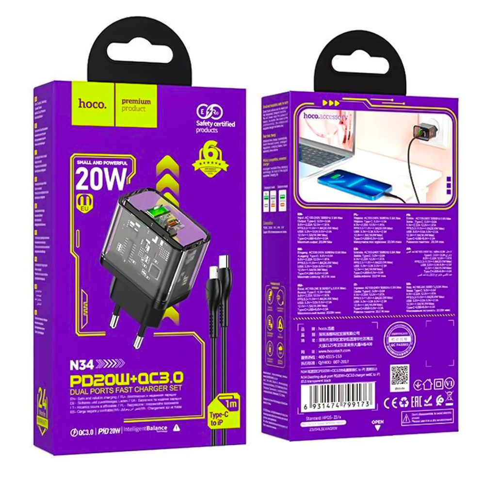Сетевое зарядное устройство Hoco N34 Dazzling – это оригинальный аксессуар, который поможет быстро зарядить большинство современных смартфонов, планшетов и других гаджетов. Модель реализована в необычном, технологичном дизайне – в стиле киберпанк с прозрачным, тонированным корпусом, что позволяет детально рассмотреть электронные компоненты. Благодаря двум разным разъемам и поддержке наиболее распространенных протоколов быстрой зарядки им можно заменить сразу несколько адаптеров. Корпус устройства надежно собран, изготовлен из прочной комбинации ABS пластика и огнестойкого поликарбоната. На нижнем торце находится вилка стандарта EU, а на верхней панели разъемы Type-C и USB.
