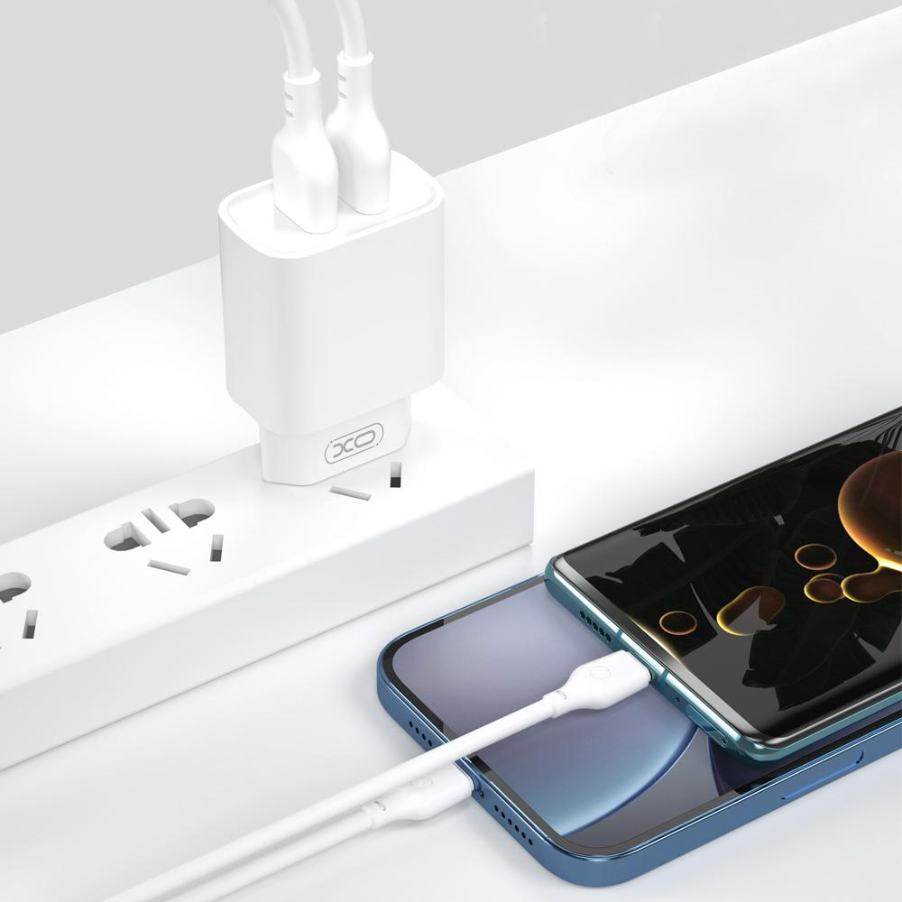Изготовлен XO CE02C из качественного пластика, гарантирующего долговечность устройства. Сила входного тока 2,1А и входное напряжение 100-240V, 50/60Hz гарантирует быструю и безопасную зарядку ваших гаджетов. В комплект входит также кабель lightning, длиной 1м.