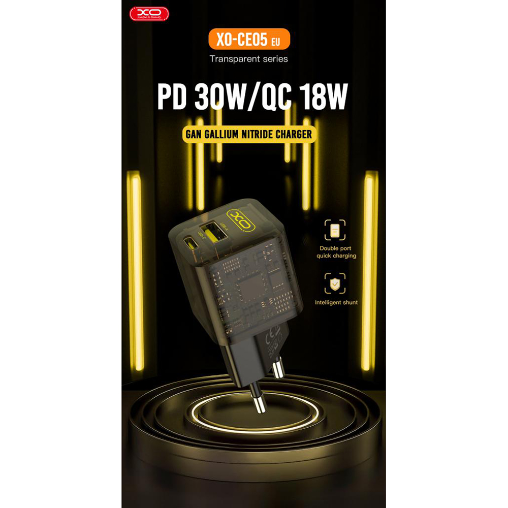 В современном мире часто возникает необходимость быстро зарядить несколько гаджетов одновременно, XO CE05 – это сетевое зарядное устройство, содержащее 1 порт USB-A с поддержкой технологии быстрой зарядки Quick Charge 3.0 и 1 порт Type-C с поддержкой быстрой зарядки Power Delivery. Модель выполнена в стильном дизайне из прозрачного ABS пластика, что позволяет пользователю видеть внутреннюю часть устройства. Общая мощность составляет 30W, номинальная сила тока составляет 3А. Производителем предусмотрена многоуровневая защита от перепада напряжения и перегрева устройства.