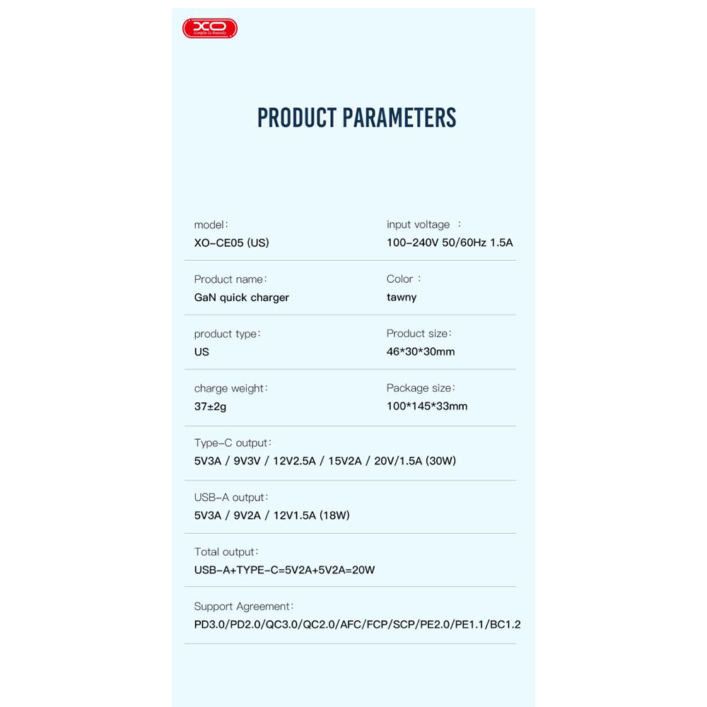 XO CE05 - это качественное, надежное, мощное и с поддержкой нескольких популярных технологий быстрой зарядки зарядное устройство, которое гарантирует быструю и безопасную зарядку ваших гаджетов.