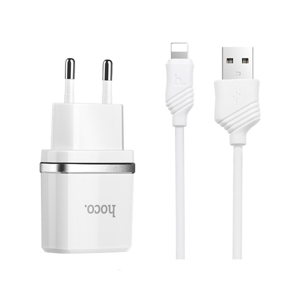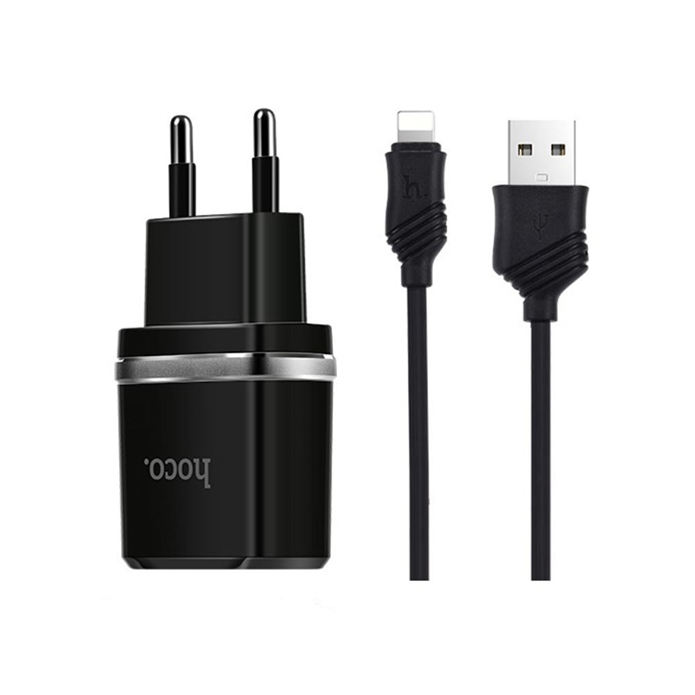 Корпус зарядного сделан из прочного глянцевого пластика, по кругу которого есть металлический ободок. Заряжать адаптер HOCO C12 может одновременно два устройства, ведь оборудован двумя USB портами, которые выдают 2,4А первый выход и 2,4А- второй соответственно. В комплекте к зарядке идет надежный Lightning Data-кабель с фирменными лейбами длиной 1м.