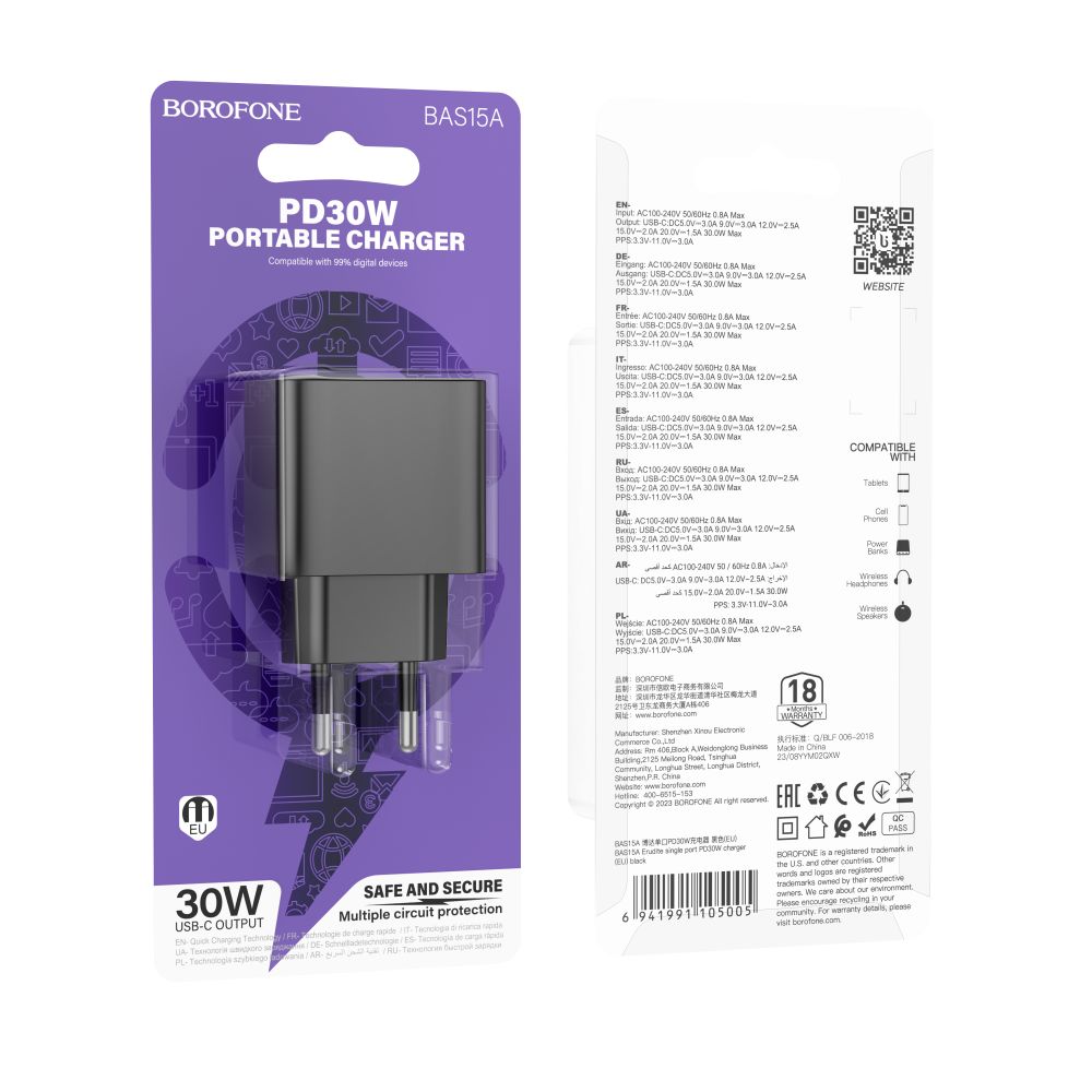 Сетевое зарядное устройство Borofone BAS15A с одним выходом USB-C мощностью 30 Вт идеально подходит для быстрой и эффективной зарядки современных гаджетов. Компактный и стильный черный дизайн делает его удобным для использования в любом месте, будь то дома или в поездке. Поддержка технологии быстрой зарядки позволяет эффективно зарядить смартфоны, планшеты и другие устройства, обеспечивая безопасность и стабильность работы.