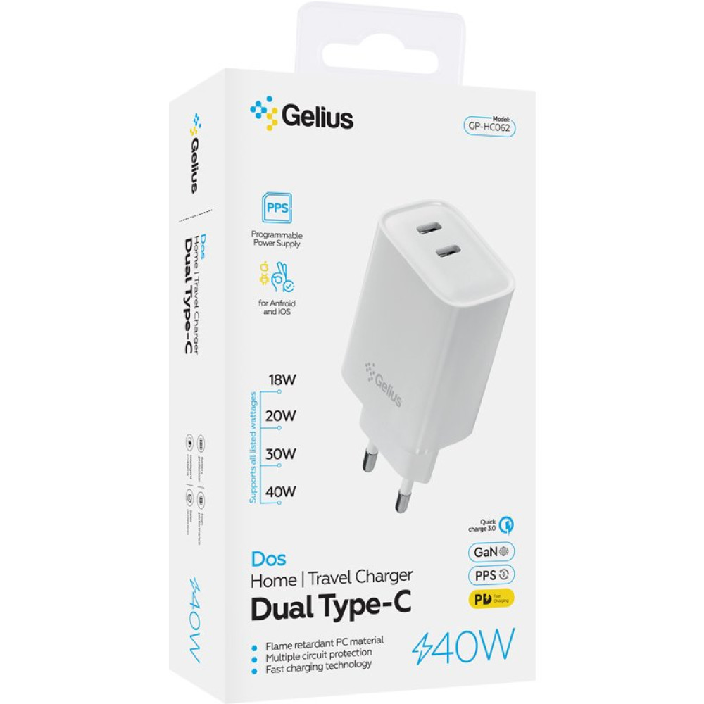 Сетевое зарядное устройство Gelius Dos имеет мощность 40W, что позволяет быстро заряжать различные устройства от смартфонов до планшетов. Благодаря двум портам Type-C можно одновременно заряжать два устройства. Это делает зарядку удобной и быстрой, что особенно важно для современных пользователей, которым необходимо заряжать несколько гаджетов одновременно.