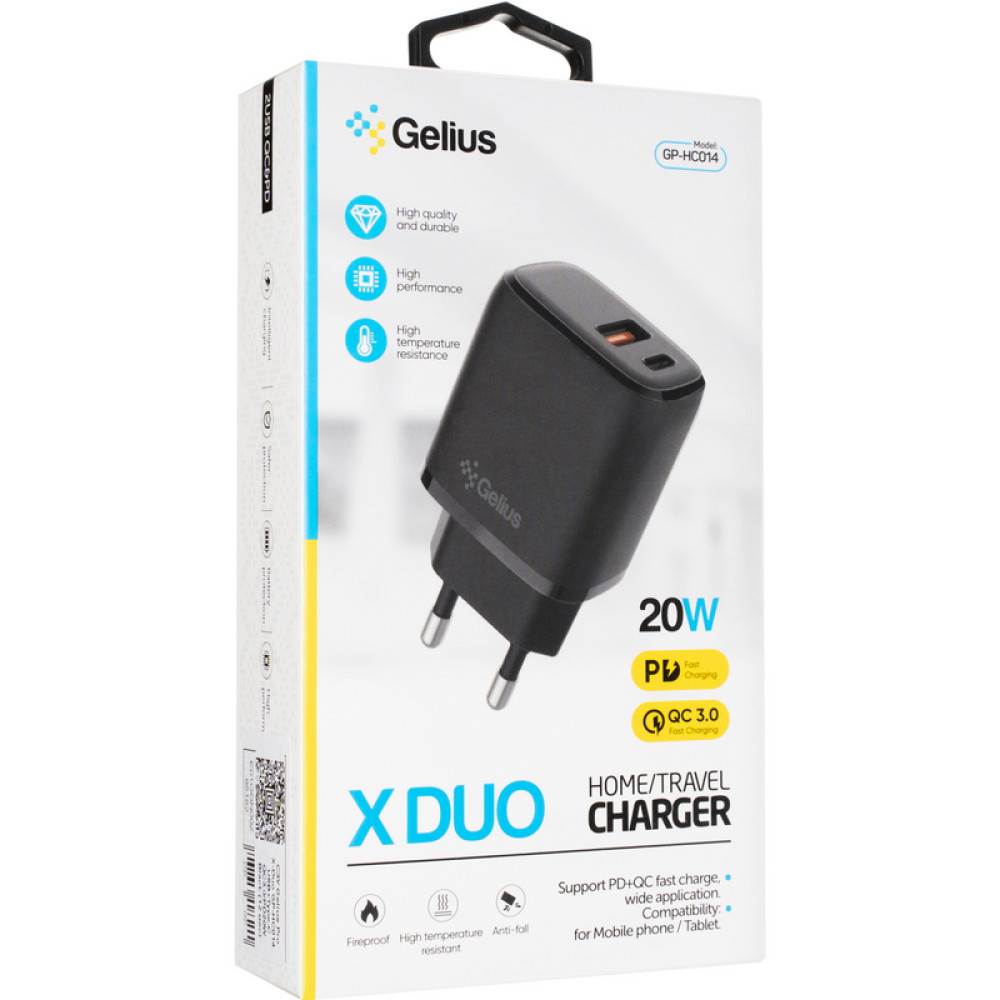Удобная и быстрая зарядкаGelius X Duo обеспечивает устройства током для быстрой зарядки мощностью до 20 Вт, позволяя быстро зарядить смартфон или планшет.Классический дизайн и качество материалаGelius X-Duo выполнен из высококачественных негорючих материалов, имеет 5 видов защиты, в том числе от высоких температур и защиту против скольжения, что гарантирует надежность и прочность продукта.Поддерживает быструю зарядкуUSB-PD и QC 3.0 Fast Charging может заряжать устройство на 70% быстрее стандартной зарядки. Это означает, что вам потребуется гораздо меньше времени для полной зарядки устройства.Интеллектуальный чип управленияИнтеллектуальная система управления, которая в зависимости от устройства выдает требуемое напряжение и ток. Таким образом, аккумулятор надежно защищен и зарядка максимально безопасна и быстра.Характеристики:Быстрая зарядка: PD+Quick Charge 3.0Выходной ток: 3 AВыходные интерфейсы: USB Type-C, USBВозможность заряжать 2 гаджета одновременноКабель в комплекте Type-C/LightningМощность: 20 Вт.