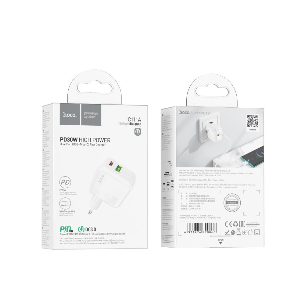 Сетевое зарядное устройство Hoco C111A Lucky поможет зарядить большинство современных смартфонов за минимальное время. Аксессуар привлекает внимание оригинальным дизайном, выделяется наличием сразу двух разных разъемов и поддержкой наиболее распространенных протоколов быстрой зарядки. Качественно собранный корпус устройства изготовлен из надежной комбинации прочного ABS пластика и огнестойкого поликарбоната, выполнен в практичной форме со скруглёнными ребрами и гранями, имеет приятную на ощупь поверхность. На одной из его боковых граней находится сетевая вилка европейского стандарта, а на другой пара разъемов - USB и Type-C. Порт USB может использоваться для быстрой зарядки совместимых гаджетов по протоколам QC, FCP и AFC. Мощность на его выходе может достигать 18Вт, а сила тока равна 3А при 5В, 2А при 9В, 1,5А при 12В. Разъем Type-C поддерживает зарядку по протоколам PD, PPS, QC, FCP и AFC с максимальной мощностью 30Вт. Сила тока на его выходе составляет 3А при 5В, 3А при 9В, 2,5А при 12В, 1.5А при 20В, 2А при 3.3-16В для PPS. Общая максимальная мощность на выходе разъемов - 30Вт. Модель оснащена системами многоуровневой защиты и интеллектуального баланса, которая отвечает за распределение исходящей мощности.