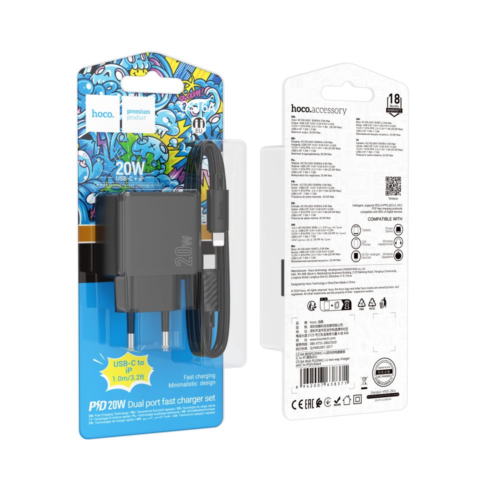 Hoco CS16A – это современное, компактное и мощное зарядное устройство, поддерживающее быструю зарядку PD (Power Delivery) и QC (Quick Charge) 3.0. Благодаря двум портам (USB-C и IP) вы можете заряжать два устройства одновременно, что делает этот адаптер идеальным выбором для пользователей Apple и других гаджетов.