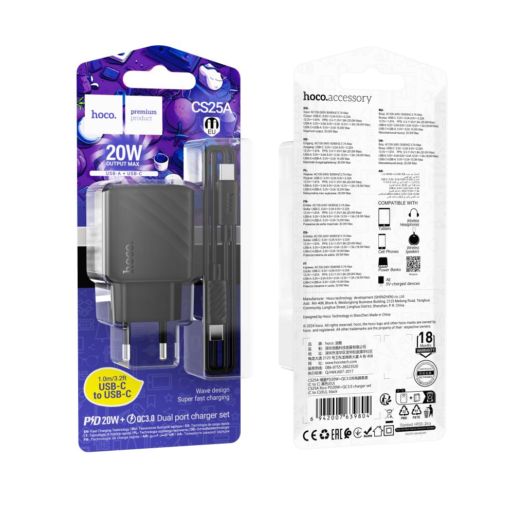Сетевое зарядное устройство Hoco CS25A – это высококачественный адаптер для быстрой и безопасной зарядки ваших устройств. Оснащен двумя портами USB-C и USB-A, он поддерживает технологии быстрой зарядки PD Power Delivery и QC Quick Charge 3.0. Благодаря мощности 20 Вт этот адаптер обеспечивает эффективную зарядку смартфонов, планшетов, беспроводных наушников и других гаджетов.