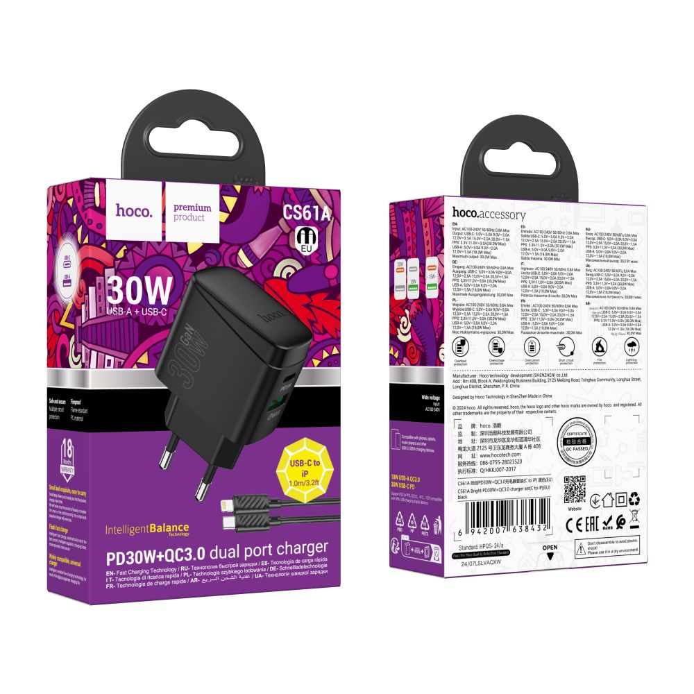 Hoco CS61A – это высококачественное сетевое зарядное устройство, которое обеспечит быструю и безопасную зарядку ваших гаджетов. Благодаря двум портам (USB-A и USB-C), оно поддерживает современные технологии Power Delivery (PD) и Quick Charge (QC) до 30 Вт, что позволяет заряжать смартфоны, планшеты и другие устройства максимально эффективно.