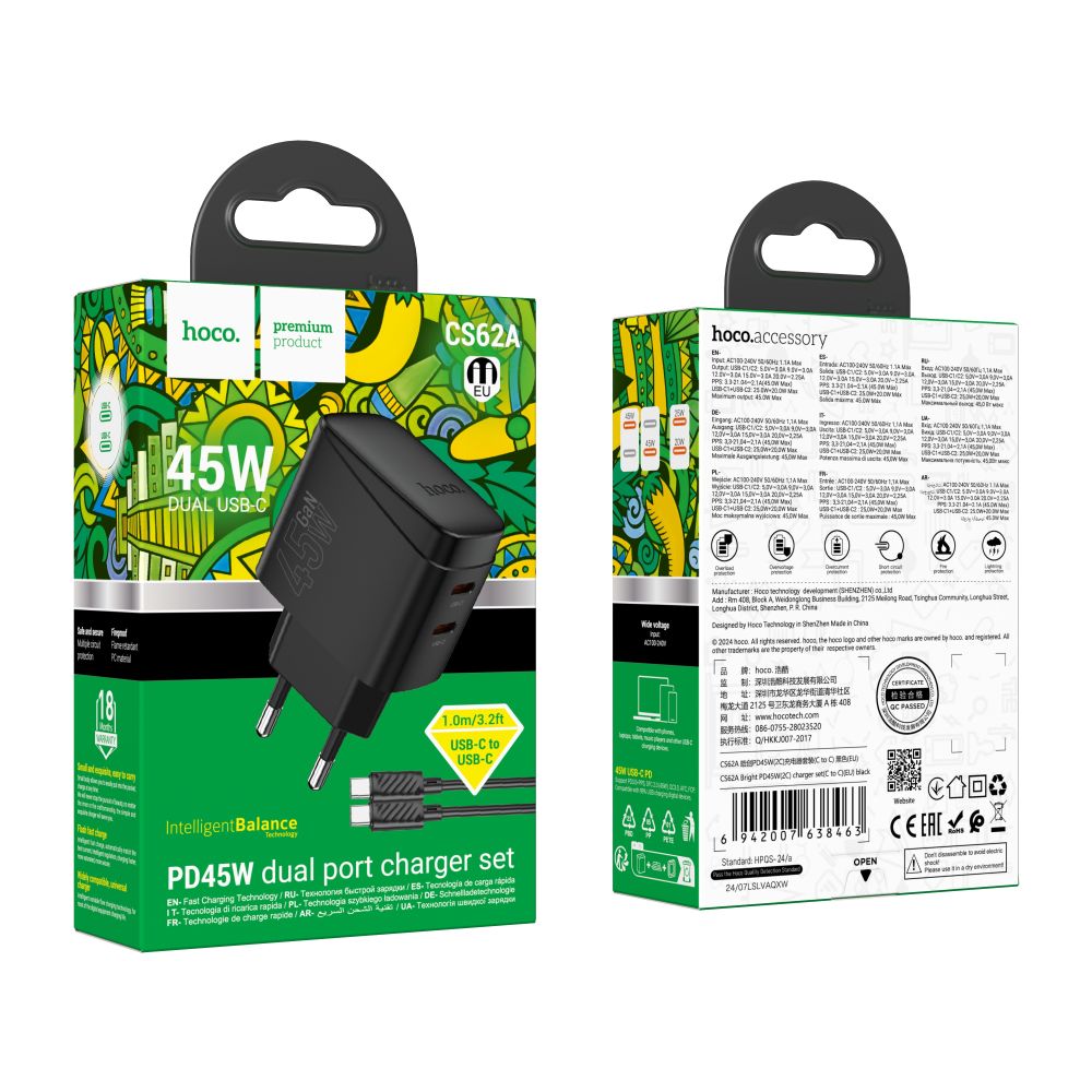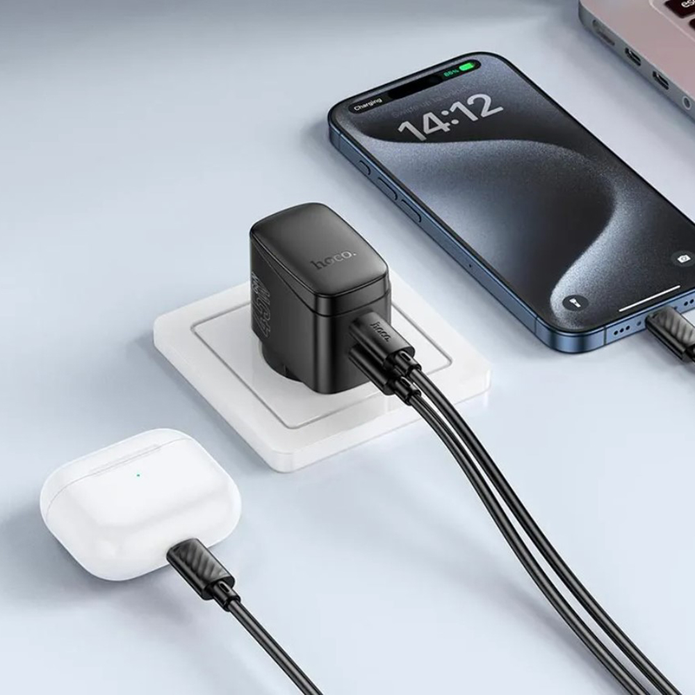 Hoco CS62A – это высокомощное и компактное зарядное устройство с двумя портами USB-C, которое использует технологию GaN (Галлий-нитрид) для повышенной производительности и эффективности. Благодаря поддержке Power Delivery (PD) и Quick Charge (QC) до 45 Вт, устройство обеспечивает максимально быструю и безопасную зарядку смартфонов, планшетов, ноутбуков и других гаджетов.