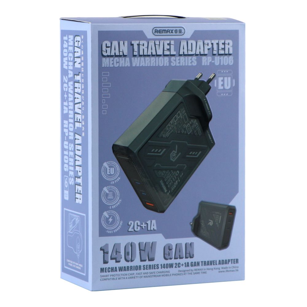 Сетевое зарядное устройство Remax RP-U106 – это универсальный адаптер, разработанный с использованием передовых технологий для быстрой зарядки современных ноутбуков, смартфонов, планшетов и других портативных гаджетов. Электронные компоненты данного устройства основаны на полупроводниках из нитрида галия (GAN), что отличает его от аналогов с кремниевыми полупроводниками со схожими характеристиками. Благодаря технологии GAN, он выделяется более компактными размерами, повышенной энергоэффективностью и не перегревается даже при максимальной нагрузке. Аксессуар выполнен в оригинальном, технологичном дизайне и имеет практичную форму. Он станет отличным выбором для использования дома и во время поездок, не займет много места в рюкзаке или в сумке вместе с ноутбуком. Его корпус надежно собран, изготовлен из прочного, огнестойкого поликарбоната. На одной из его боковых граней находится сетевая вилка стандарта EU, а на другой – LED индикатор, разъем USB (A) и 2 разъема Type-C (C1 и C2). Диапазон входящего напряжения составляет 110-240V. Мощность на выходе разъема USB может достигать 22.5W (5V/4.5A, 9V/2A, 12V/1.5A), Type-C (C1) – 140W (5V/3A, 9V/3A, 12V/3A, 15V/3A, 20V/5A, 28V/5A), Type-C (C1) – 100W (5V/3A, 9V/3A, 12V/3A, 15V/3A, 20V/5A). Разъемы могут использоваться одновременно, при этом максимальная и общая мощность на выходе будет зависеть от их комбинации: C1+C2=65W+65W, C1/C2+A=100W+22.5W, C1+C2+A=65W+45W+22.5W. Модель оснащена системами многоуровневой защиты и интеллектуального распределения мощности, поддерживает технологию PD3.1 и другие наиболее распространенные протоколы быстрой зарядки. Такие характеристики предоставят возможность зарядить всего за 30 минут полностью разряженный MacBook Pro 16-inch на 55%, iPhone 14 на 50%, Huawei Mate40 Pro на 53% или Lenovo IdeaPad 14pro на 50%.