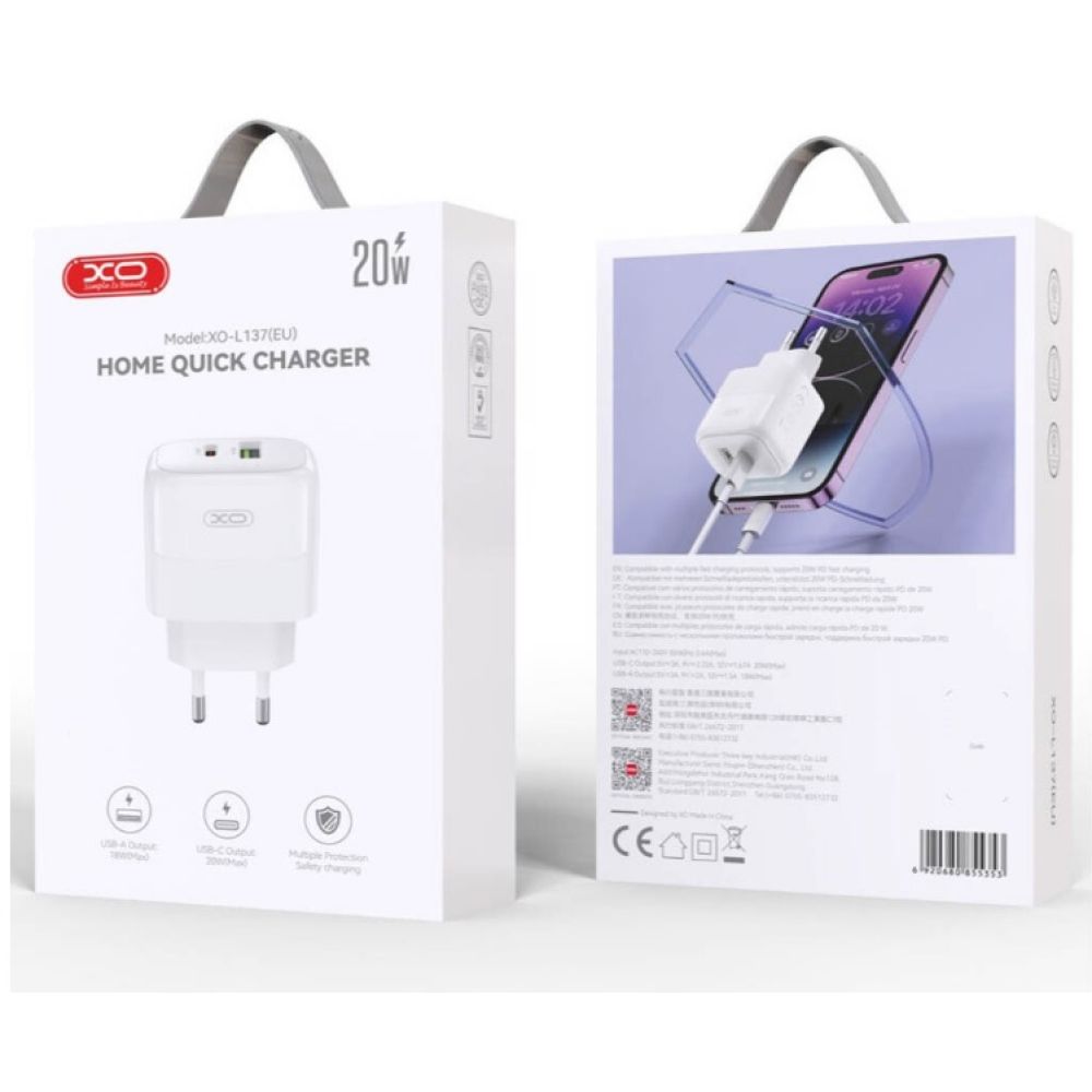Сетевое зарядное устройство XO L137 заменит два обычных адаптера и станет отличным выбором для эффективной зарядки современных гаджетов дома, в офисе или в поездках.