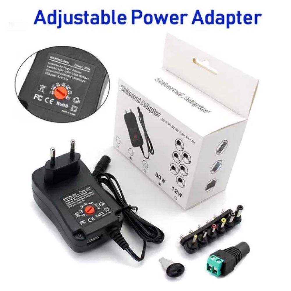 Встроенный DC-кабель с 8 насадками (2.5–5.5 мм, Micro-USB, LED-коннектор)